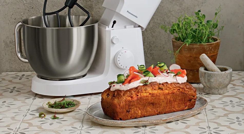 Reikės (8 porcijoms): keksui: 280 g miltų, 300 ml jogurto, 2 kiaušinių, 4 šaukštų tarkuoto parmezano sūrio, 1 raudonos paprikos, 50 g žaliųjų alyvuogių be kauliukų, 2 šaukštų alyvuogių aliejaus („extra virgin“), 2 šaukštų cukraus, 2,5 šaukštelio kepimo miltelių, 0,5 šaukštelio druskos; „glajui“: 250 g kreminio sūrio, 100 g riebios grietinės, 100 g rūkytos lašišos, 2 šaukštelių citrinų sulčių, druskos; papuošti: rūkytos lašišos griežinėlių, ridikėlio, agurko, paprikos, alyvuogių, žalumynų.