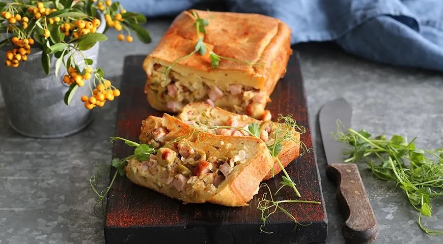 Pyragas su rūkytu karbonadu ir alyvuogėmis