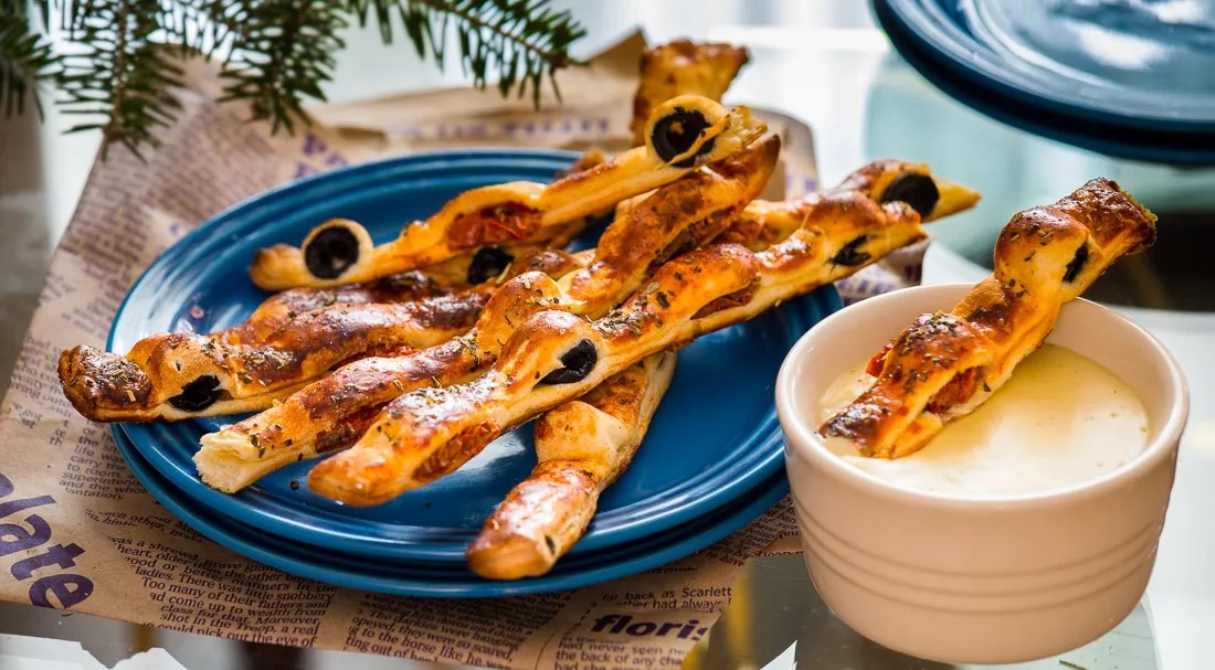 Reikės (10 porcijų): 1 pakuotės sluoksniuotos tešlos, 10–15 vytintų pomidorų aliejuje, 20–25 juodųjų alyvuogių, 1 kiaušinio, džiovintų čiobrelių arba Provanso žolelių.