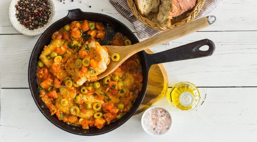 Reikės (5 porcijoms): 500 g prinokusių pomidorų, 3 česnako skiltelių, 400 g žaliųjų alyvuogių su citrinomis arba ančiuviais, 1 kg baltos žuvies filė, 50 g miltų, alyvuogių aliejaus („extra virgin“), druskos, šviežiai maltų juodųjų pipirų.