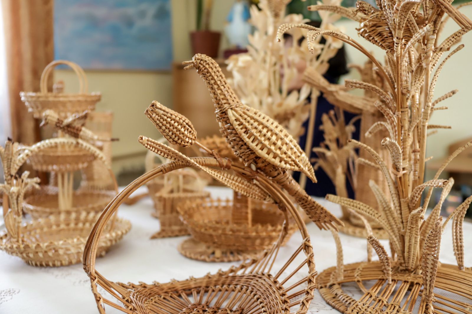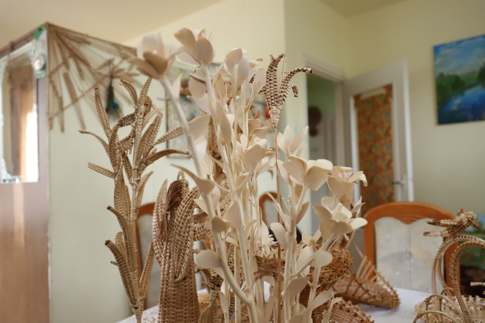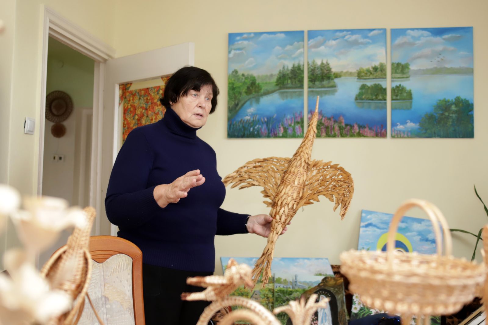 O įėjus vidun nebežinai net kur akis kreipti – ant kambarių sienų spalvingi paveikslai, pinti stilizuoti kryžiai, lėkštės, ant stalų, lentynėlių – iš vytelių pinti įvairūs kūriniai.