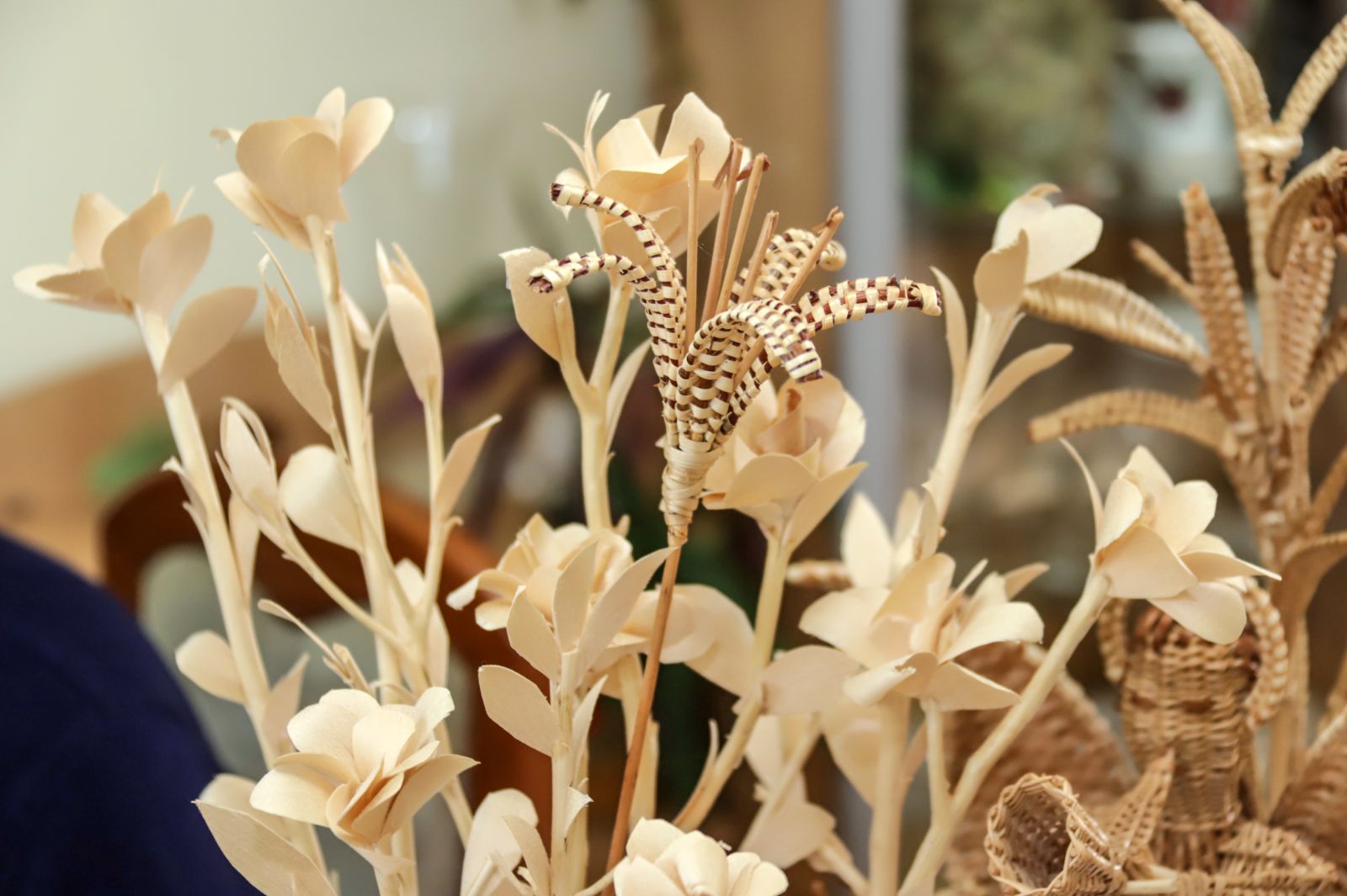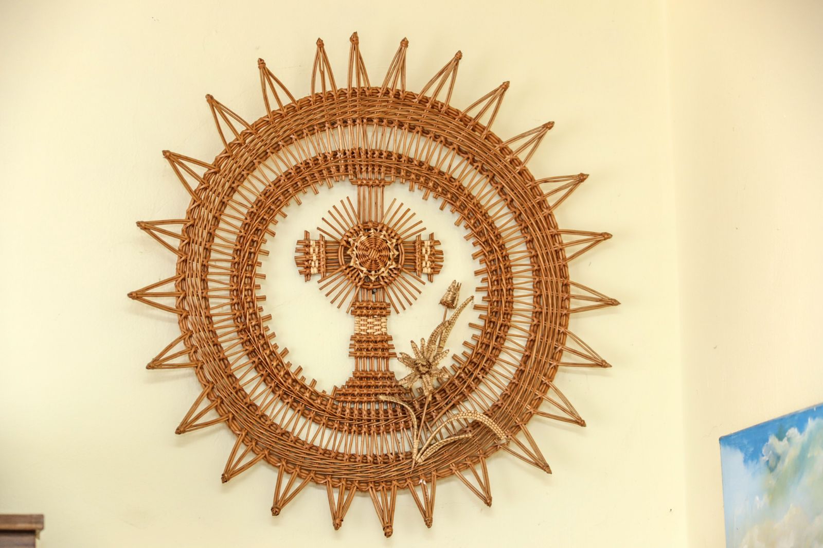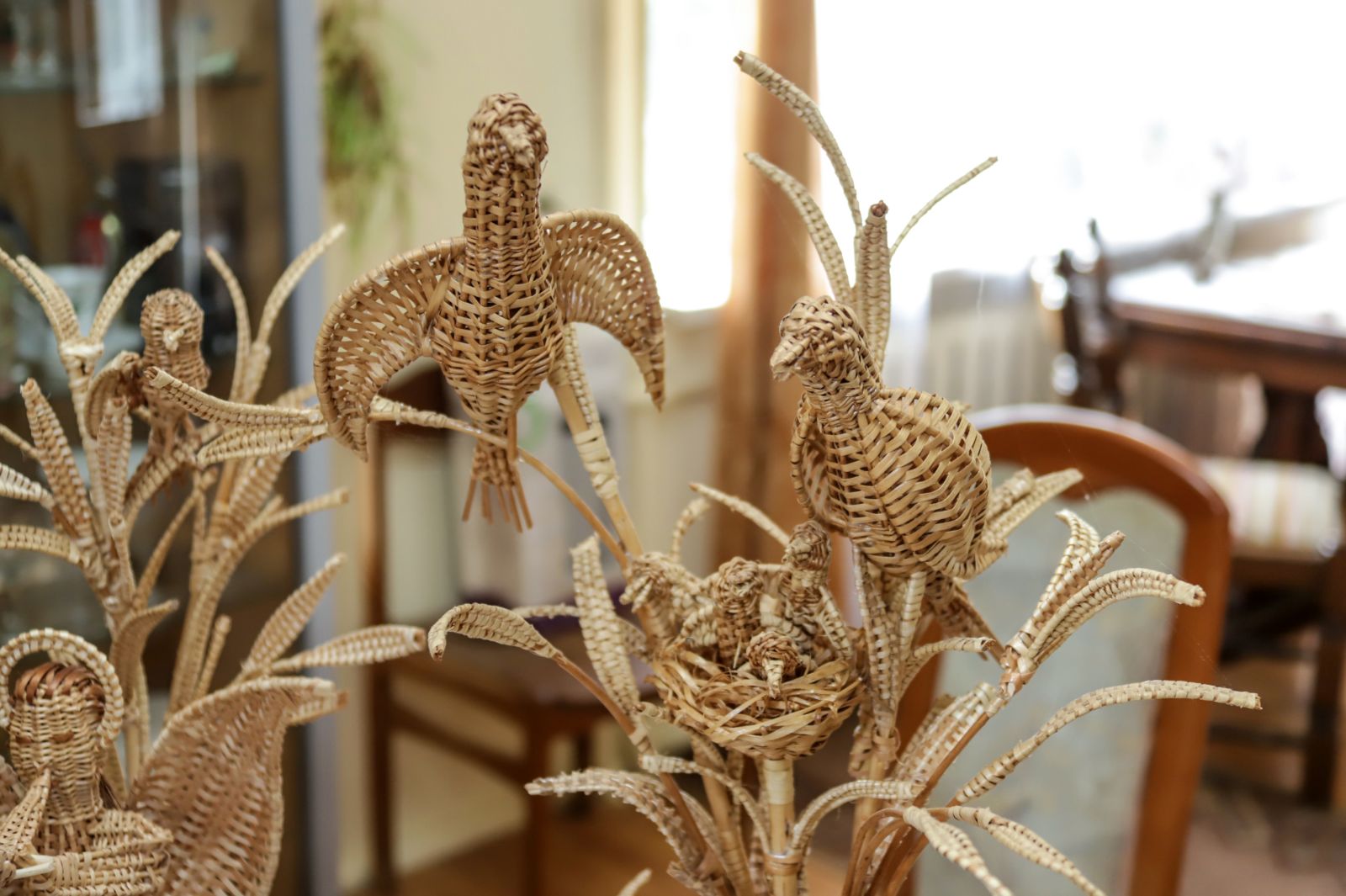 O įėjus vidun nebežinai net kur akis kreipti – ant kambarių sienų spalvingi paveikslai, pinti stilizuoti kryžiai, lėkštės, ant stalų, lentynėlių – iš vytelių pinti įvairūs kūriniai.