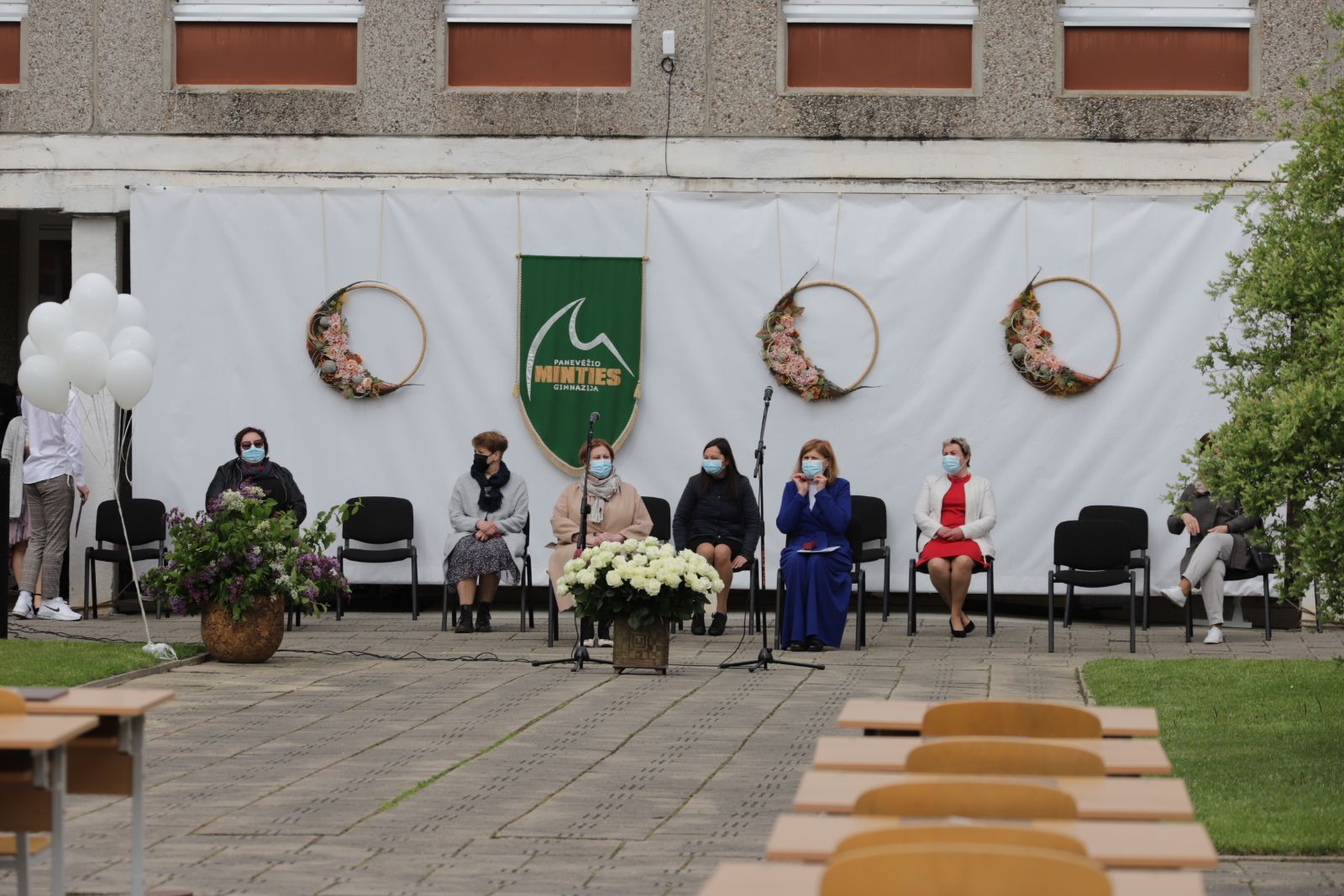 Panevėžio „Minties“ gimnazija šiemet išleidžia 80 abiturientų. Trys klasės kas valandą rinkosi į paskutinę pamoką. Ji, kaip ir pernai, vyko vidiniame gimnazijos kiemelyje ir abiturientai sėdėjo saugiais atstumais sustatytuose suoluose.