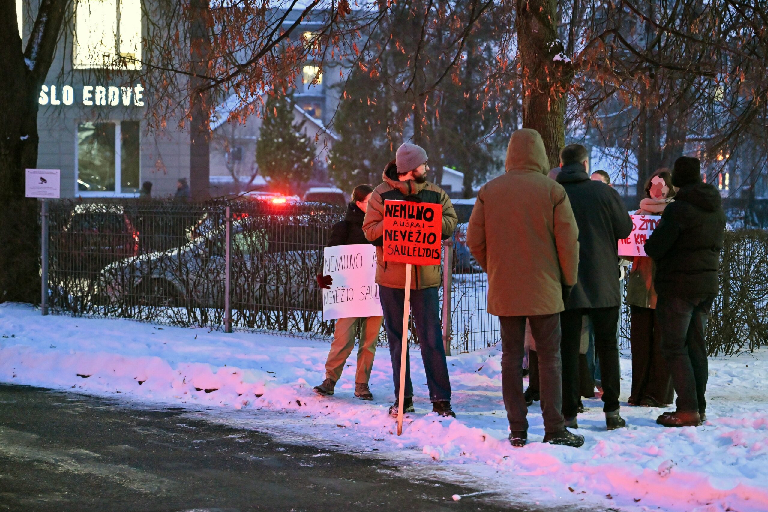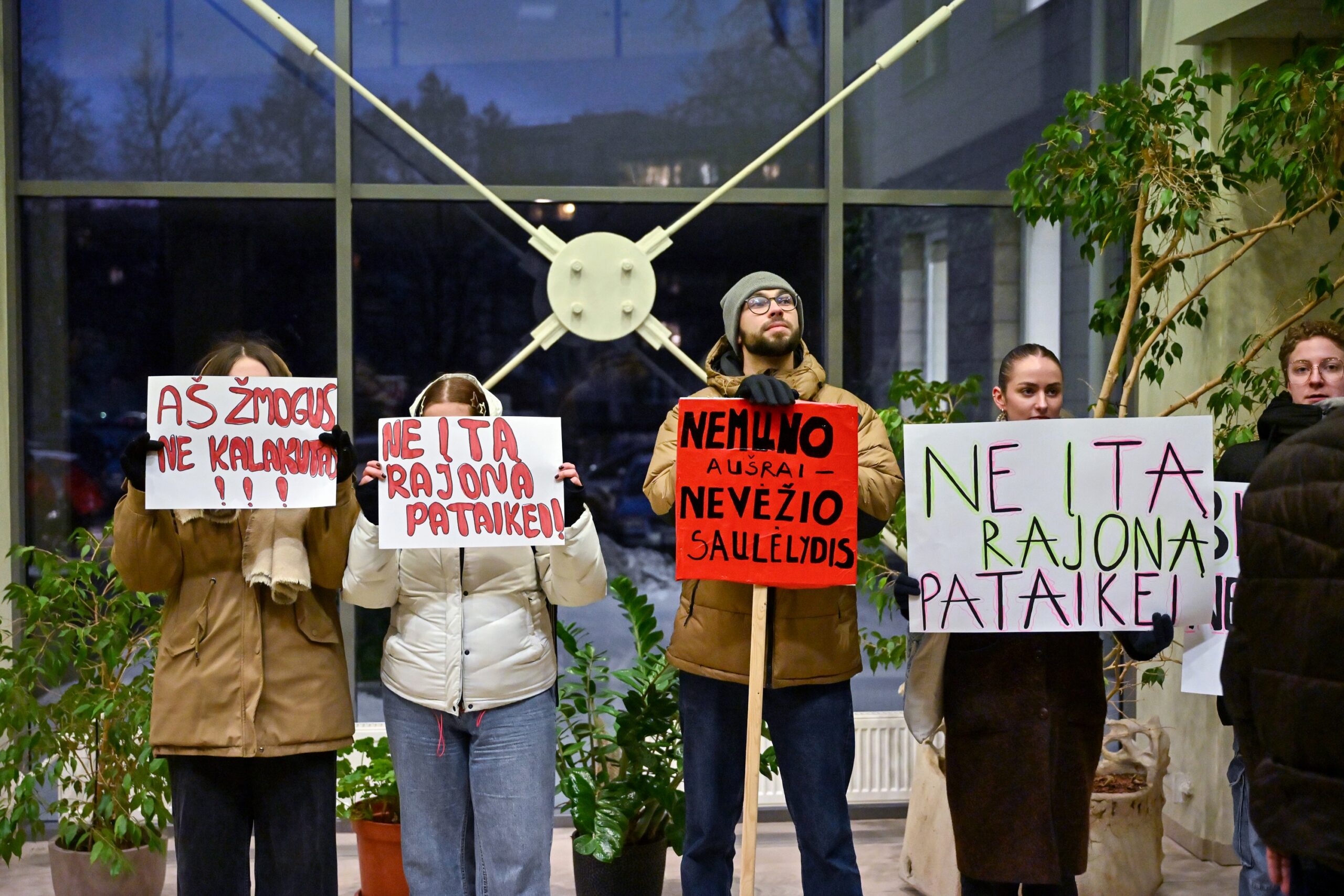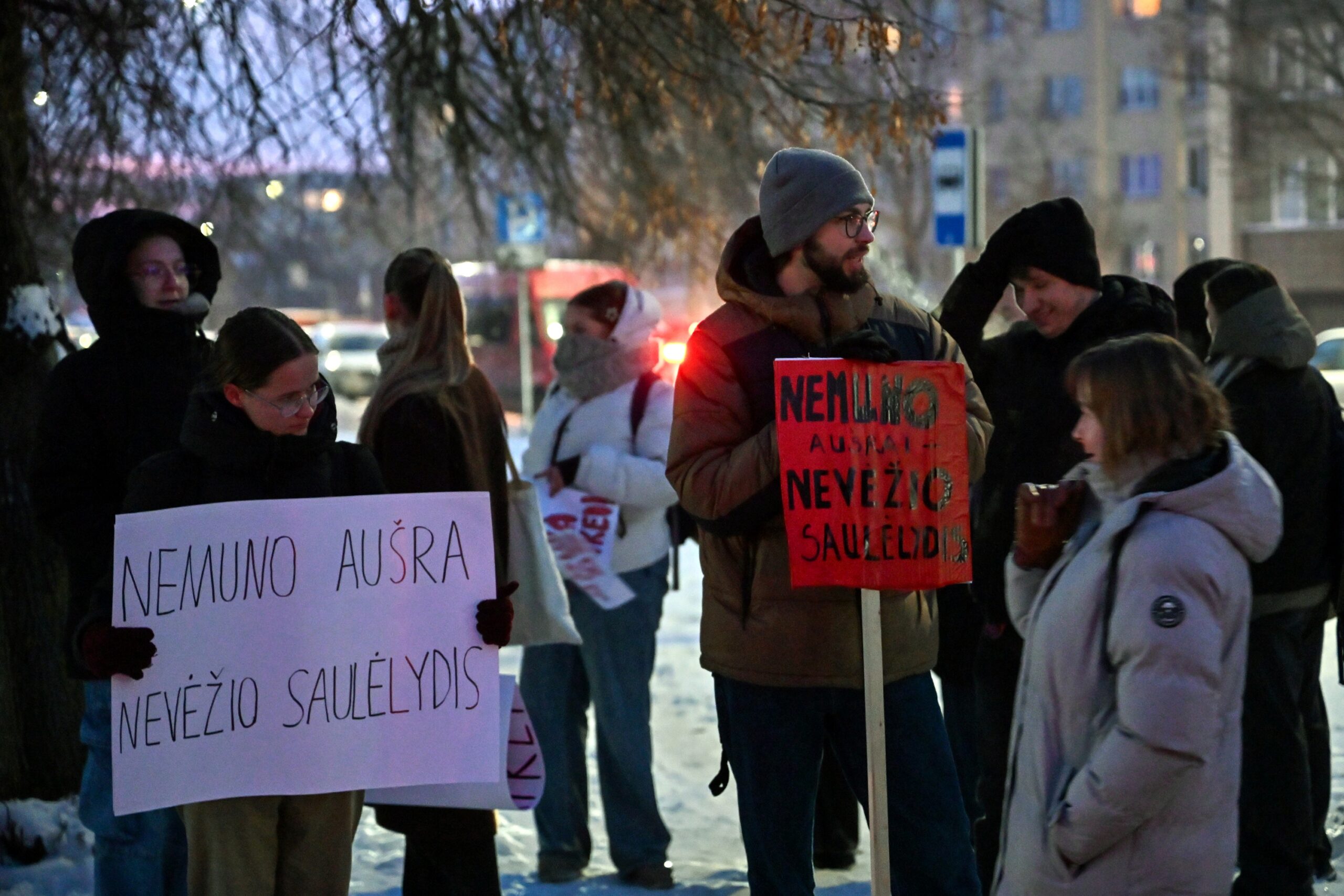 Net gaila jaunimo.kuris už kelis eurus turéjo stovéti du plakatu rankose . Kiti negaléjo suvaldyti gédis jausmo- bandé slêptis, użsidengdamo veidą plakatu.
