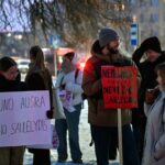 Būrys panevėžiečių į susitikimą su rinkėjais atvykusį R. Žemaitaitį pasitiko iškėlę plakatus: