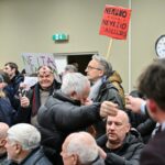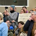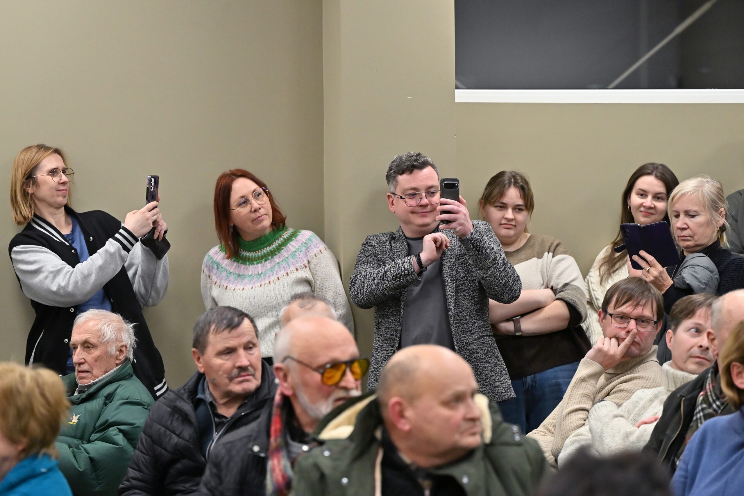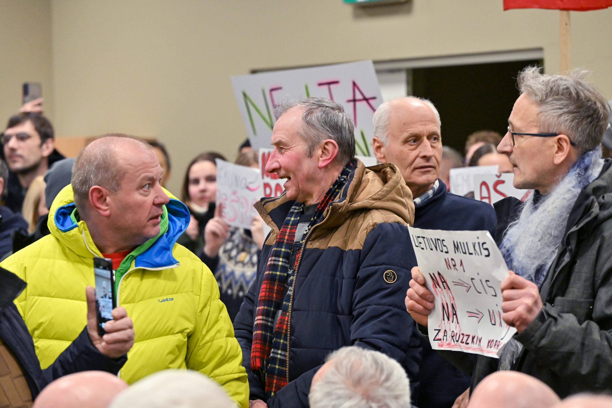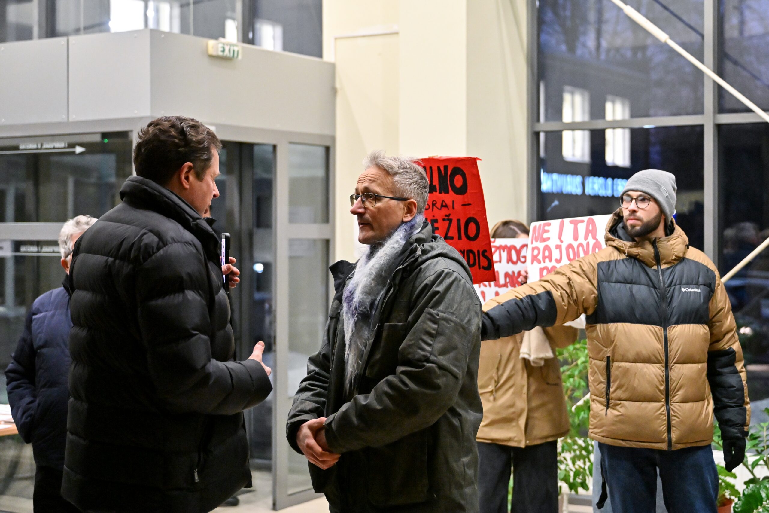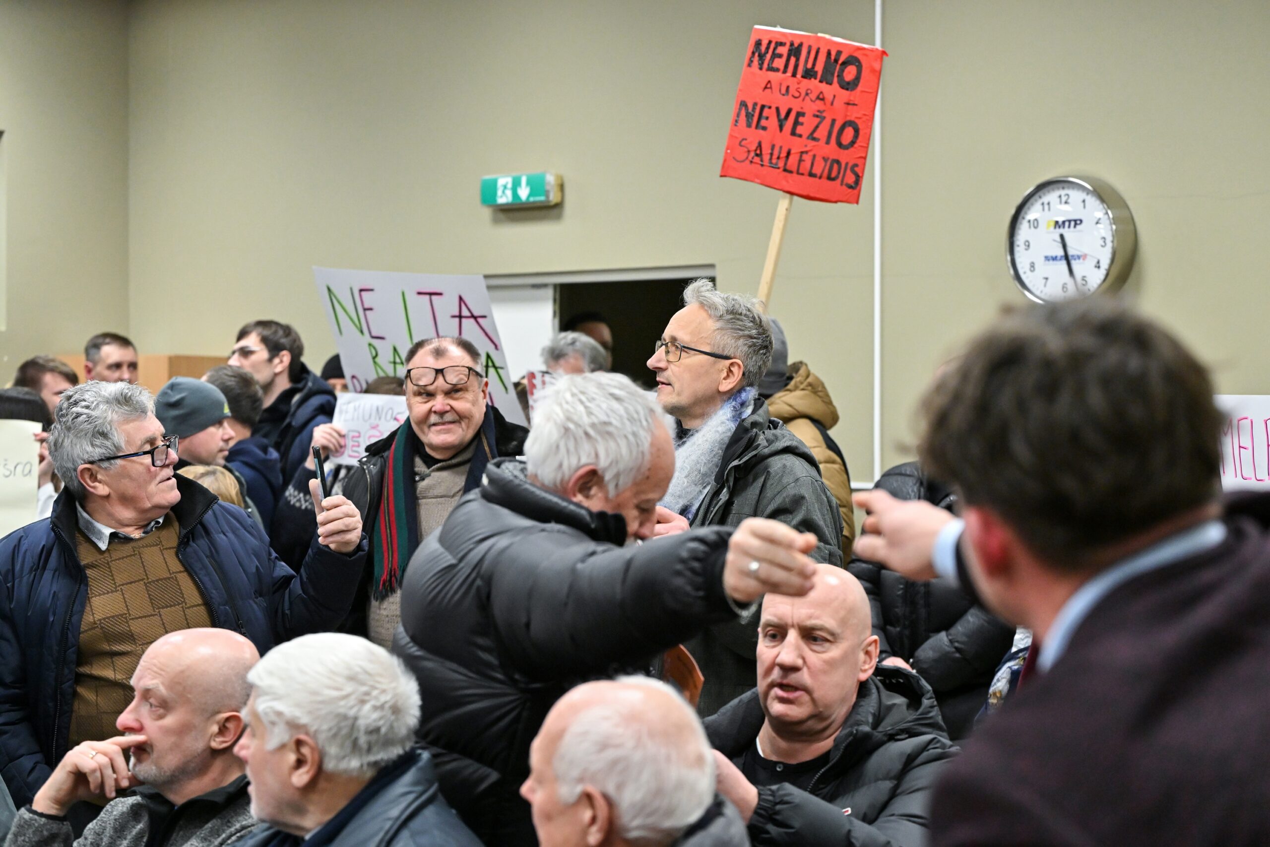 „Melo detektorius“ – šūktelėjo vienas iš protestuojančiųjų prieš „Nemuno aušrą“ ir jos vedlį. Nepaisant per garsiakalbį pasigirdusių raginimų evakuotis, niekas iš salės nespruko.