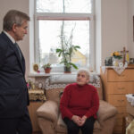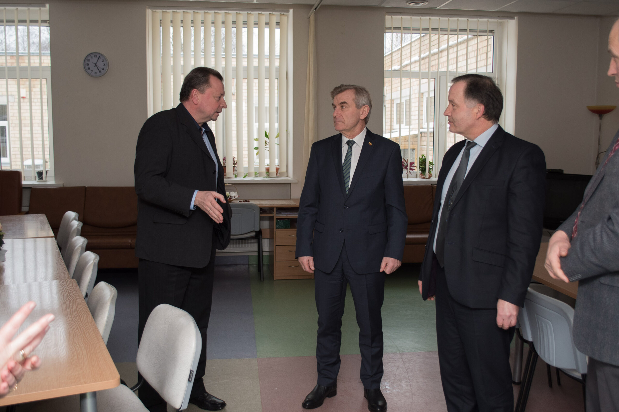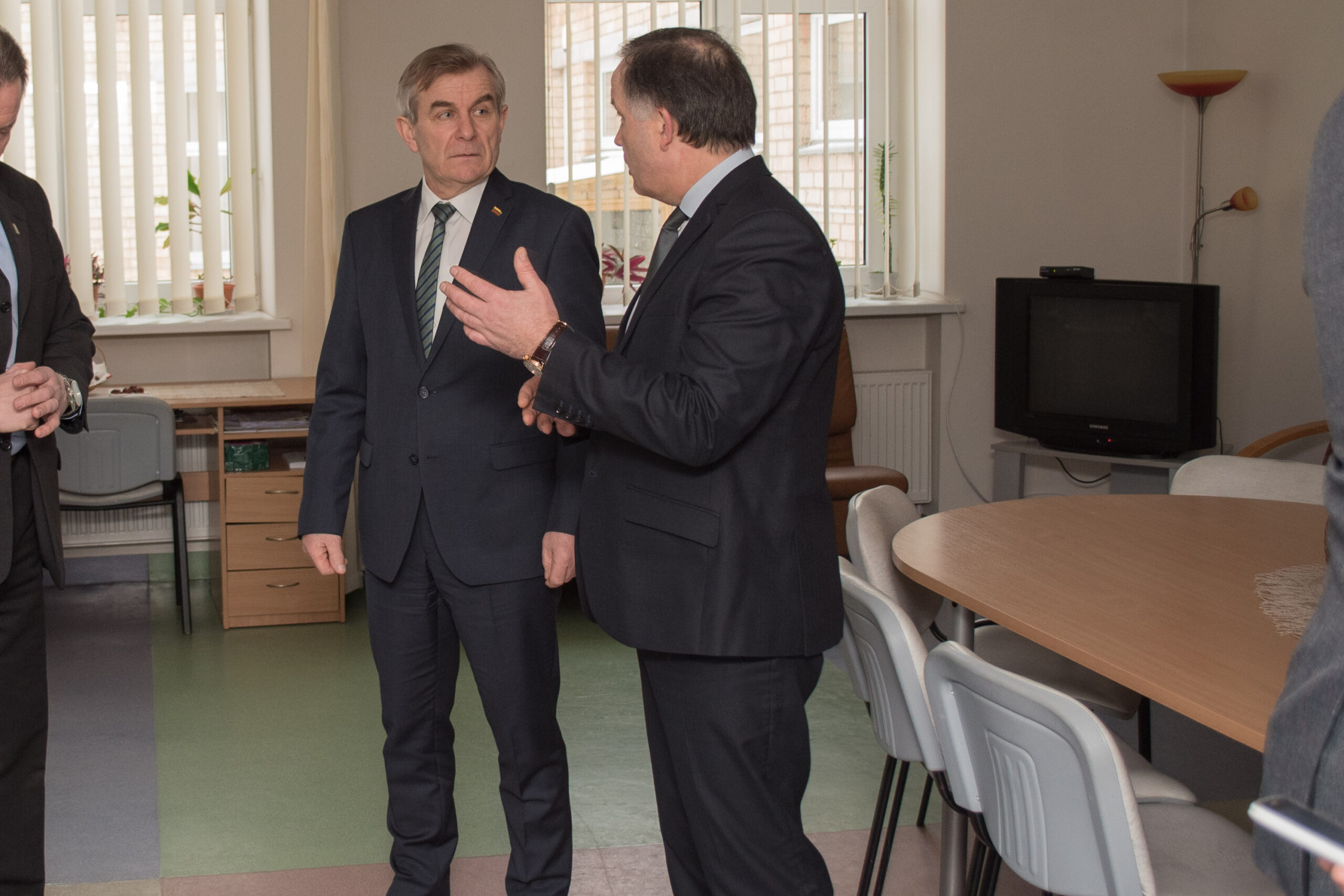 Čia direktoriaus Gintaro Navicko palydėtas Seimo pirmininkas bendravo su socialinės globos namų gyventojais. Viena jų, 84-erių Onutė, džiaugėsi svečiu ir gyrė jam savo naują gyvenimą valstybinėje įstaigoje. Jos kaimynas Antanas netgi pakvietė politiką pažaisti kortomis.