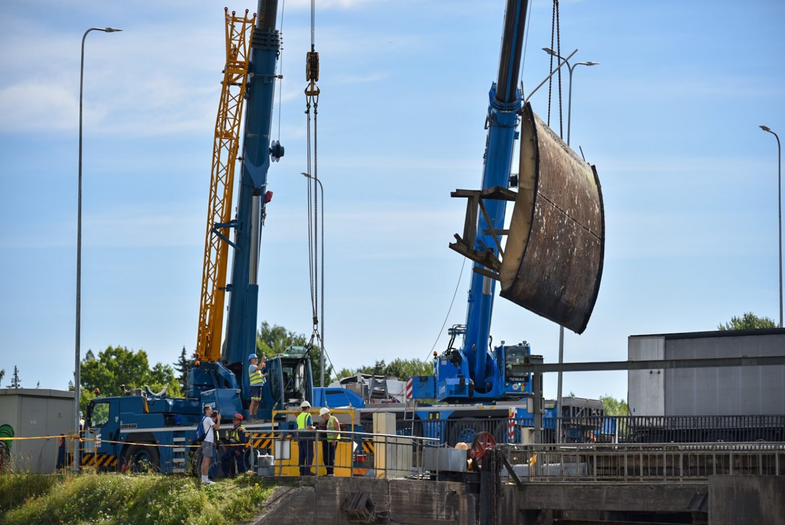 Ties užtvanka įmonė „Montuotojas“ atgabeno du itin galingus kranus sunkiam skydui iškelti. Kaip ir planuota, iškėlimo darbai užtruko maždaug dvi valandas.
