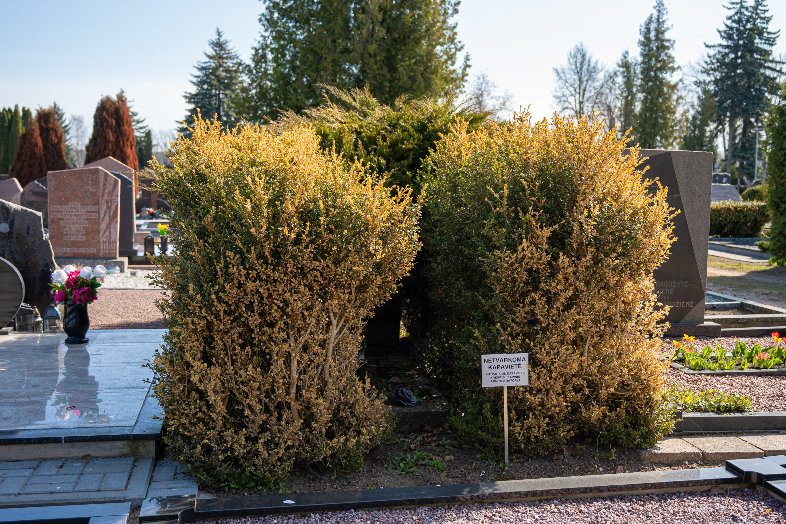 Artėjant Motinos dienai į Panevėžio Kristaus Karaliaus kapines atvykstantieji tvarkyti artimųjų kapų neatsistebi masiškai nugeltusiais, daug kur jau ir lapus numetusiais buksmedžiais.