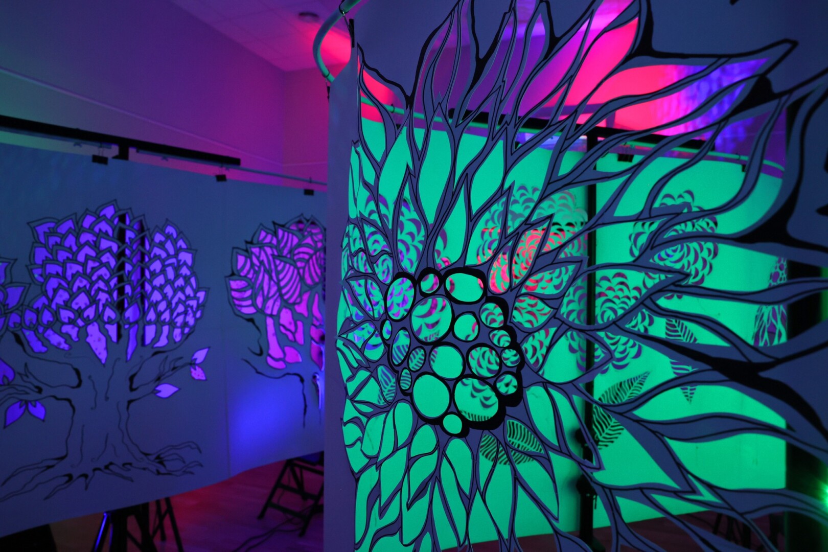 Iš popieriaus sukurtas raižinys gamtos motyvais dėl šviesos efektų virto daugiamačių figūrų visuma.