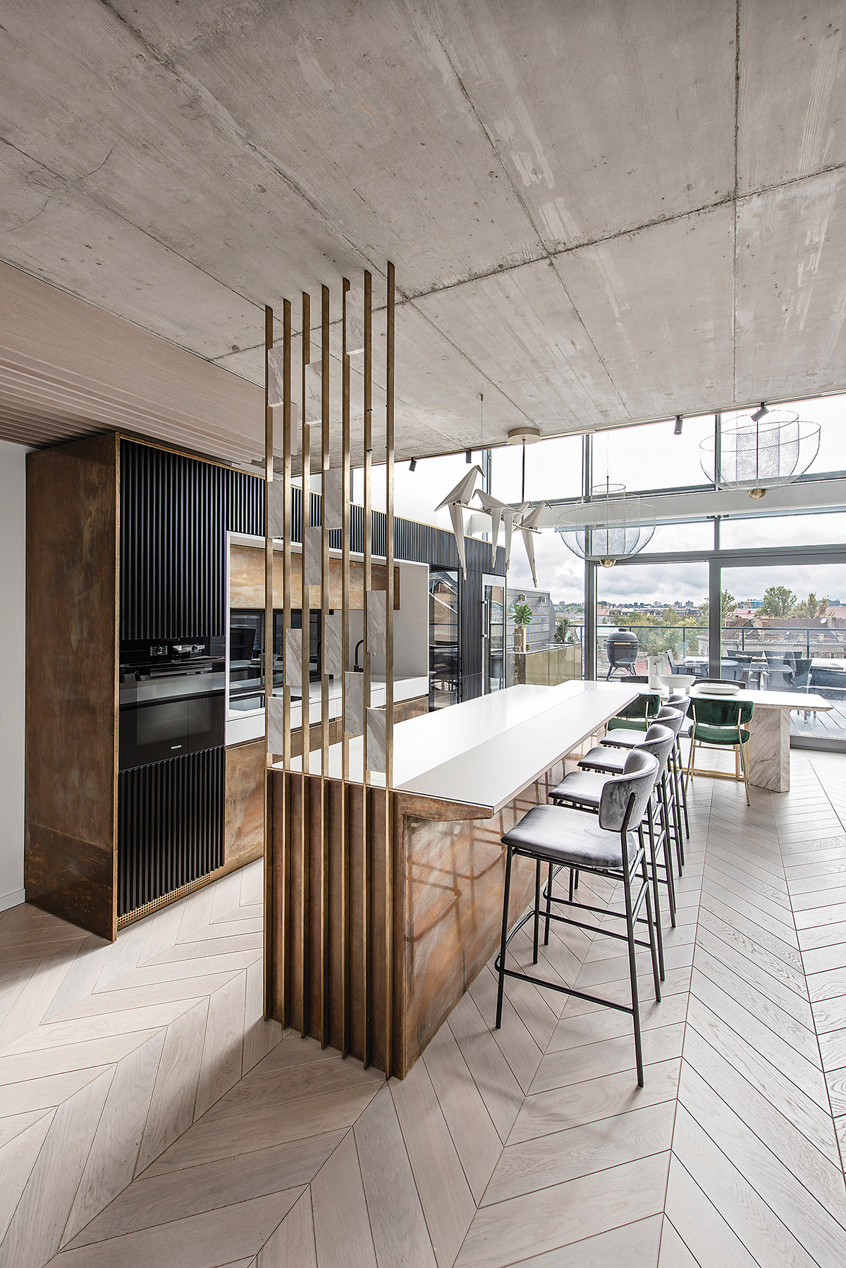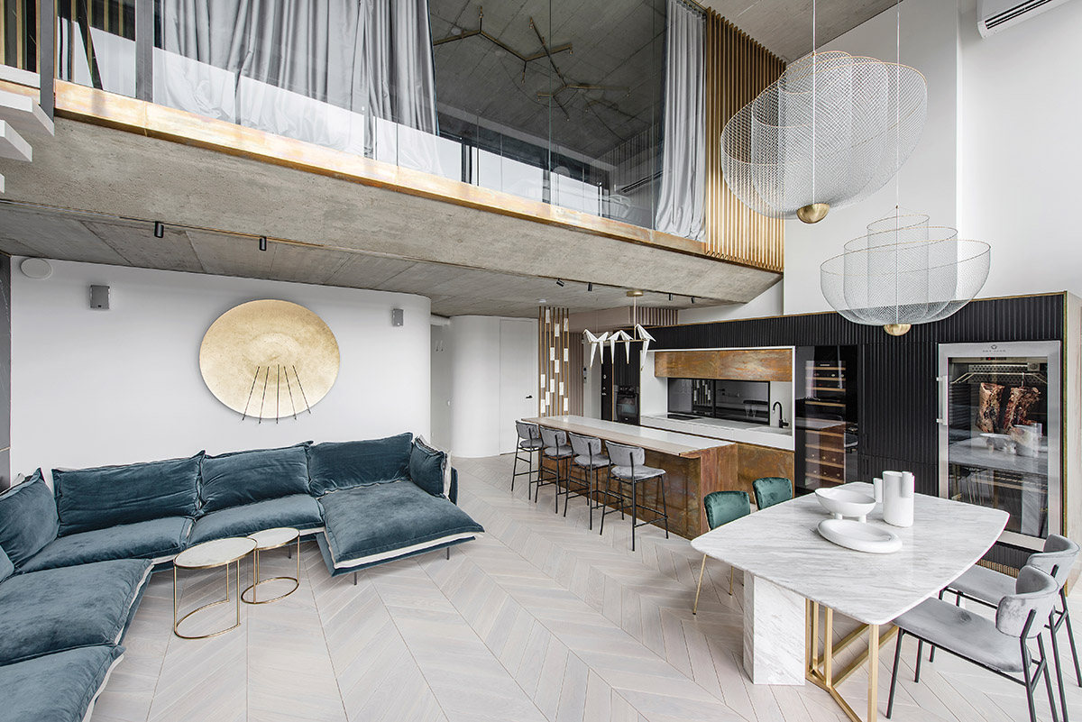 Aktyviai darbų procese dalyvavę savininkai prašė sukurti prabangius namus su industrinio stiliaus elementais. Kai kurias pasikartojančias detales, pavyzdžiui, žalvario intarpus, pasufleravo čia pat, už lango, kyšantys cerkvės bokštai.