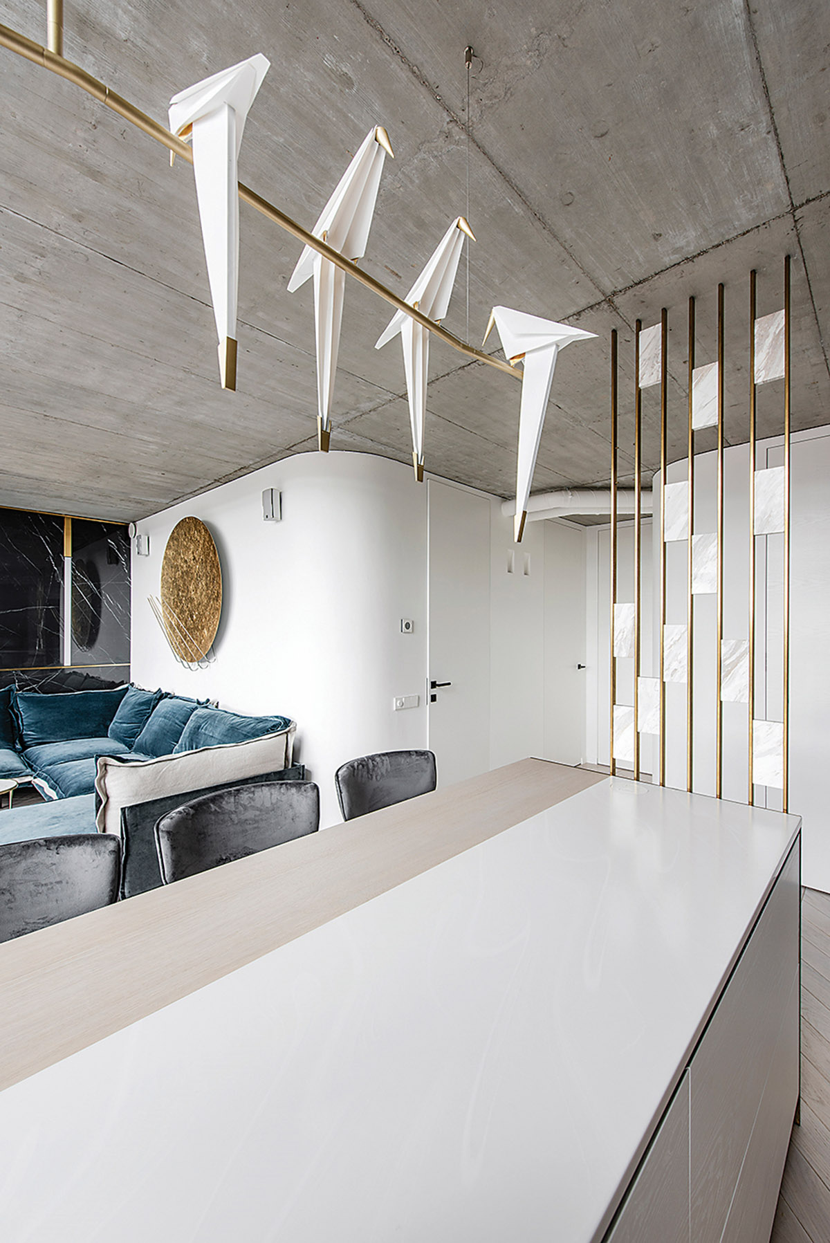 Tik užėjus į apartamentus, dešinėje, – vaikų kambariai, vonia ir pagalbinės patalpos. Kairėje yra virtuvės zona, valgomasis ir gyvenamoji erdvė. Patalpas skiria simbolinis koridorius, kurio viena siena – ažūriniai žalvario elementai su įdėtinėmis marmuro detalėmis. Šitaip zonos funkciškai padalintos, bet erdvės ir šviesos pojūtis neprarandamas. Koridoriaus link vaikų kambarių sienos suapvalintos. Pasak projekto autorės, užlenkus kampus erdvė optiškai išsiplečia.