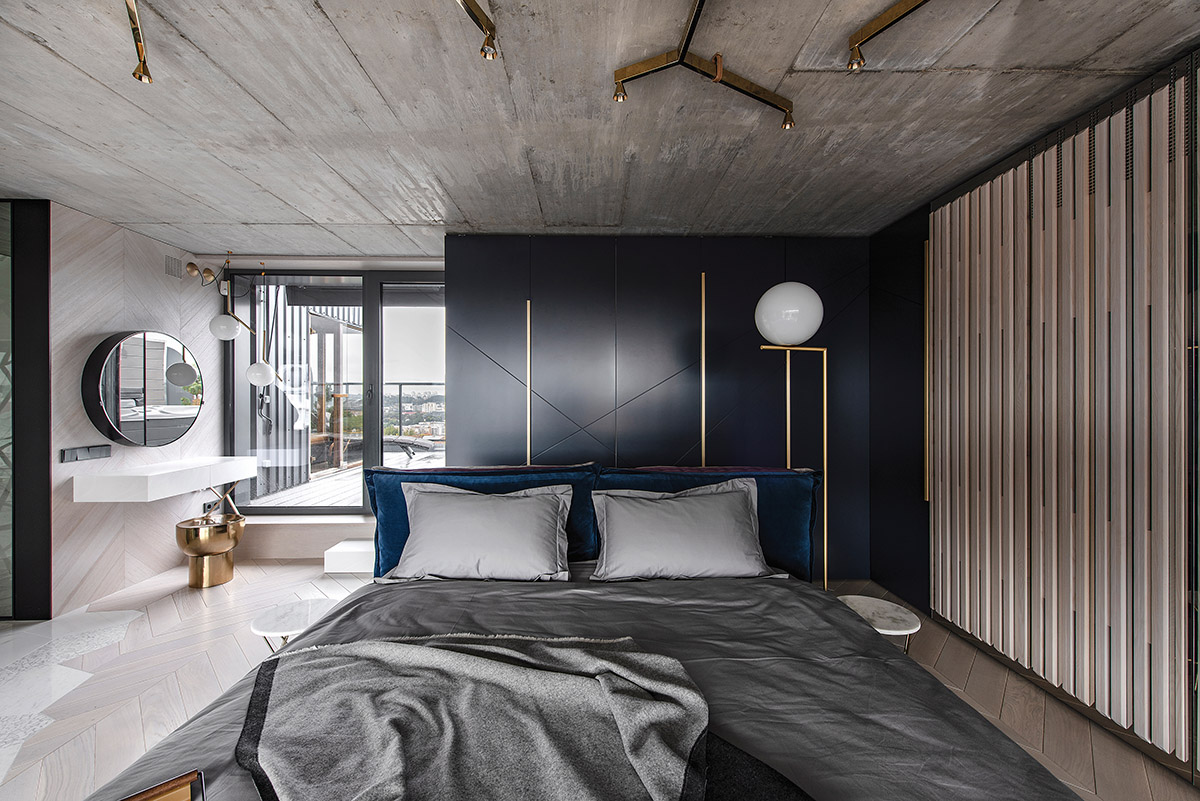 Per abi miegamojo sienas architektė suprojektavo talpias spintas. Į medines grindis įsiliejančios plytelės simboliškai įveda į vonios zoną. Stiklinėje dušo sienoje pasikartoja interjerą vienijantys žalvario motyvai, tarytum pratęsiantys tokio pat metalo lubų šviestuvus. Prie lango – baltas kosmetinis stalelis, virš jo, ant grindų raštą atkartojančios sienos, kabo veidrodis su spintele. Tualeto ir dušo erdvę skiria baldinė spinta, sukurta apsvarsčius praktinį daiktų padėjimo klausimą. Iš miegamojo patenkama į terasą, kur architektė įgyvendino dar vieną šeimininkų pageidavimą – turėti pirtį ir sūkurinę vonią.
