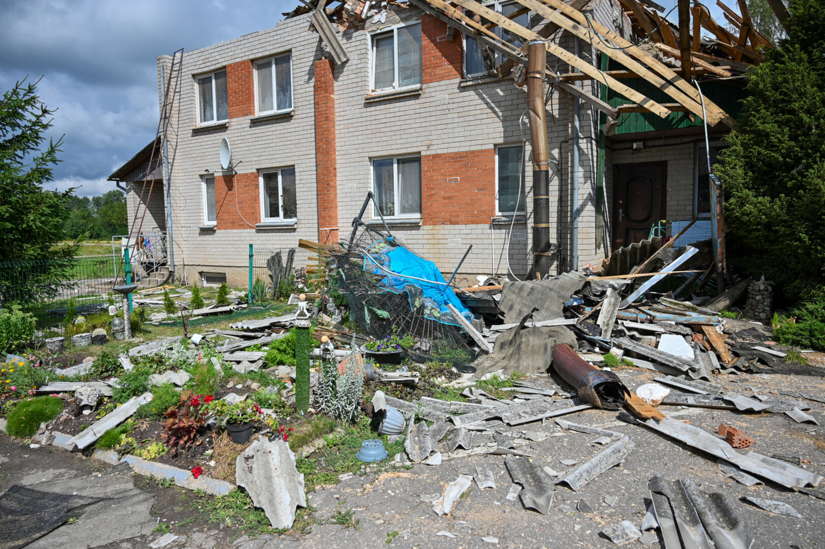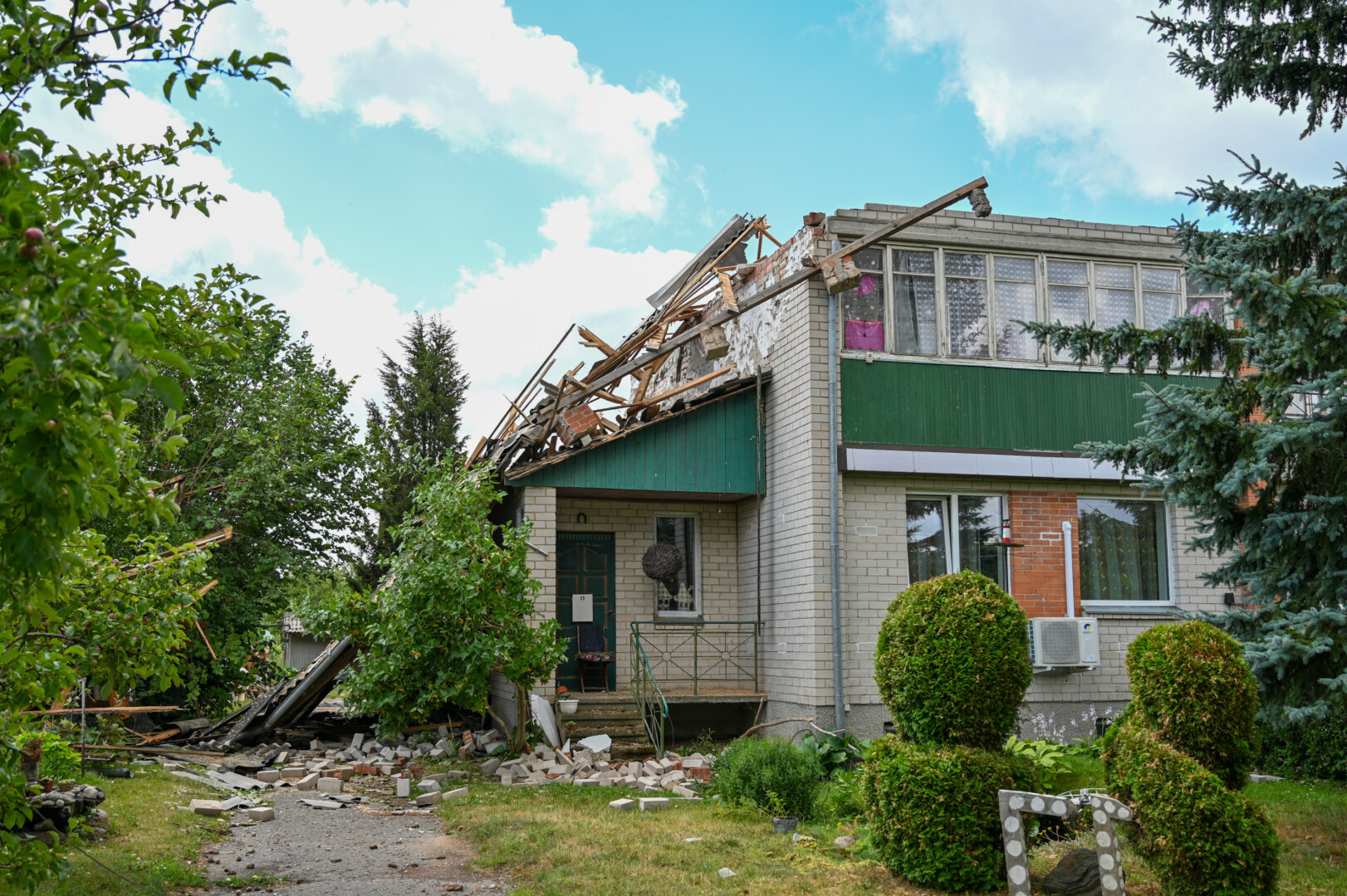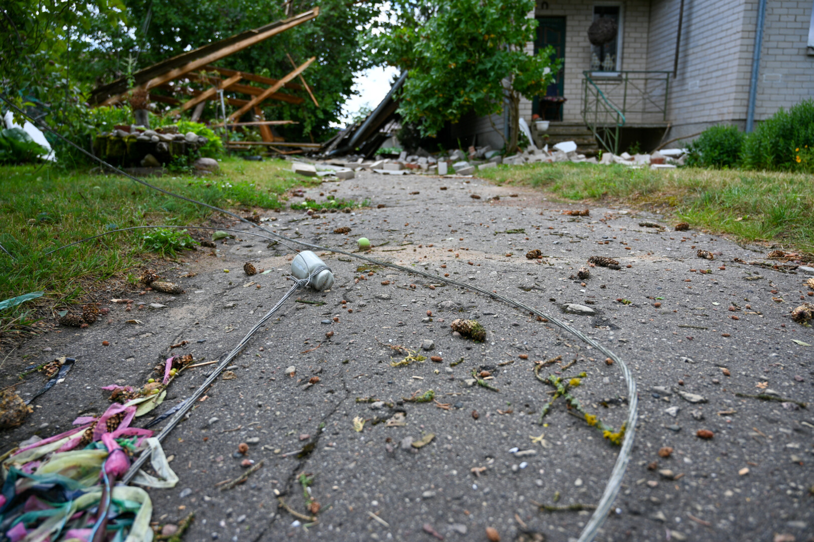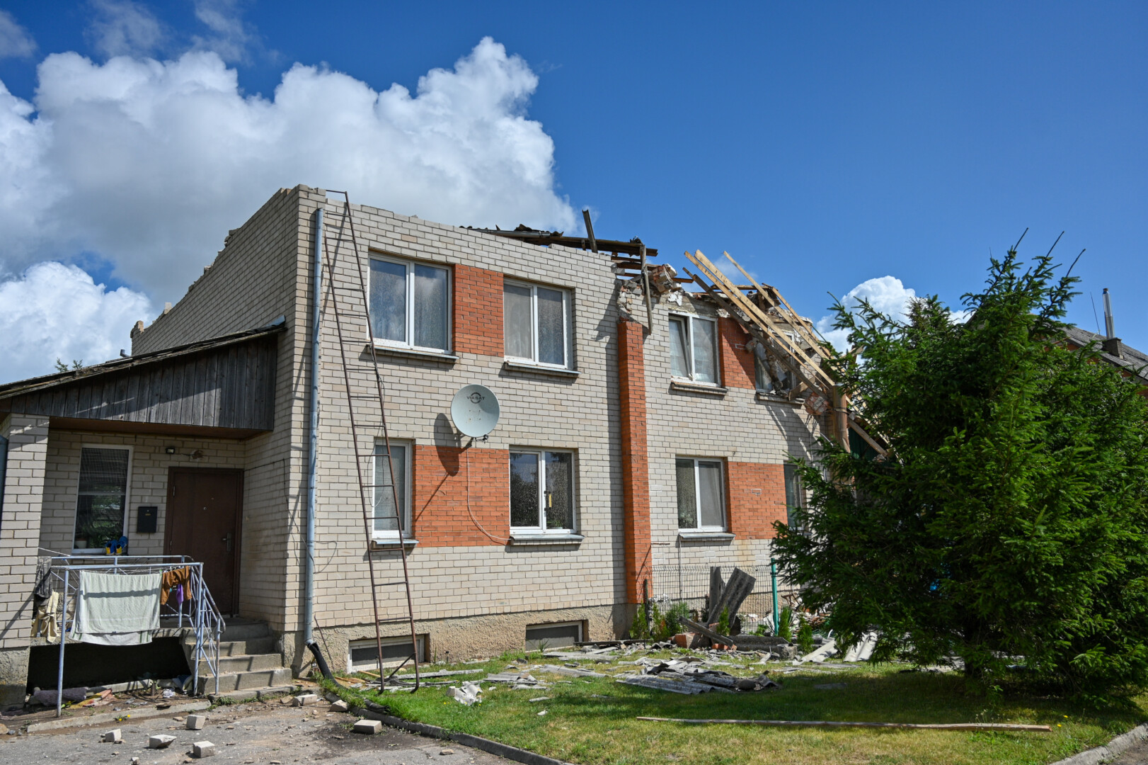 Pačiame miestelio pakraštyje stūksantis dviejų aukštų dvibutis mūrinukas visai liko be stogo. Aplink namą mėtėsi nutraukti elektros laidai, nulaužtos medžių šakos. Kritusi stogo konstrukcija visiškai užtvėrė vieną įėjimą į kiemą.