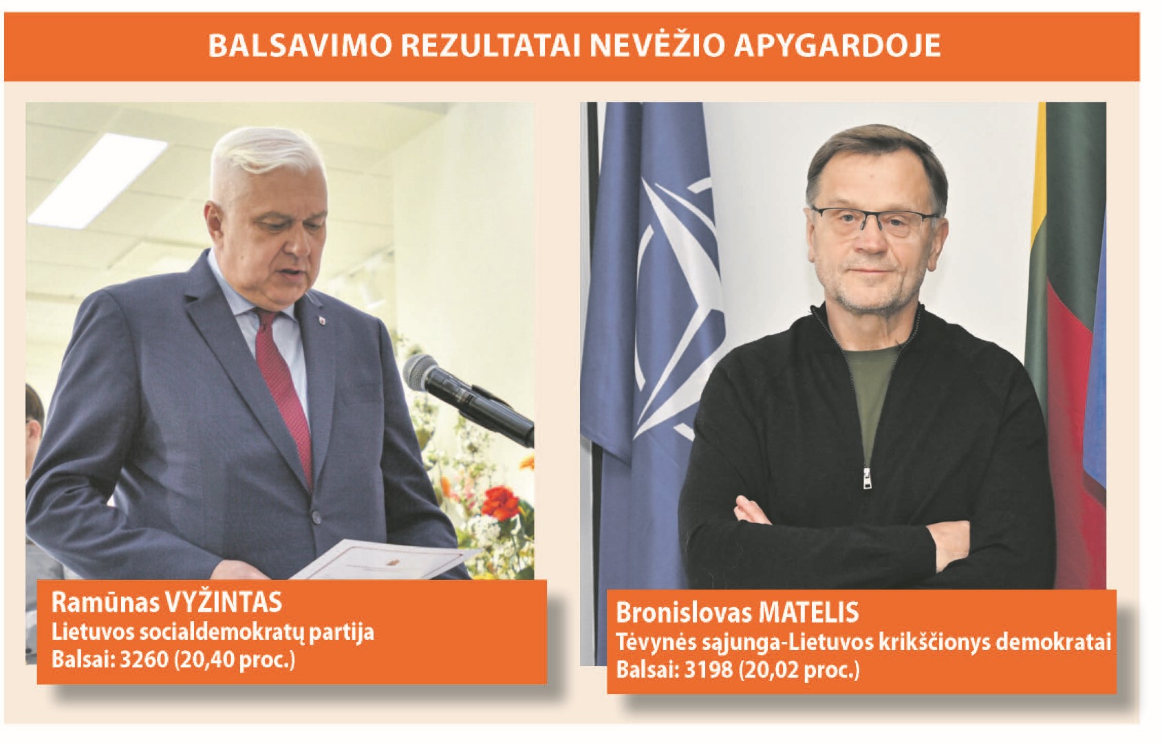 Nevėžio apygardoje seimūnas konservatorius Bronislovas Matelis prasiveržė į antrąjį turą, kur jo laukia didesnį rinkėjų balsų kraitį susikrovęs miesto Tarybos narys socialdemokratas Ramūnas Vyžintas.