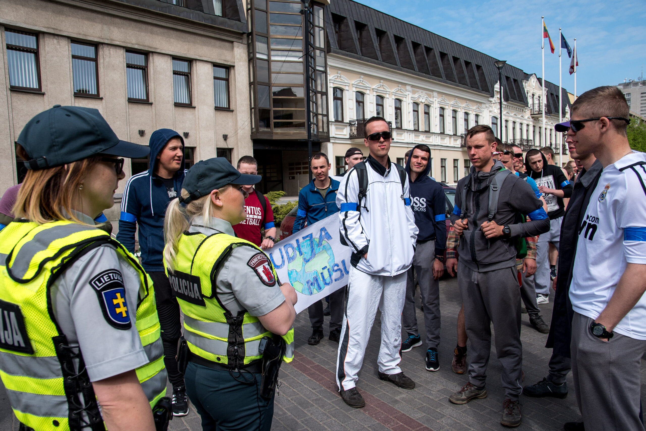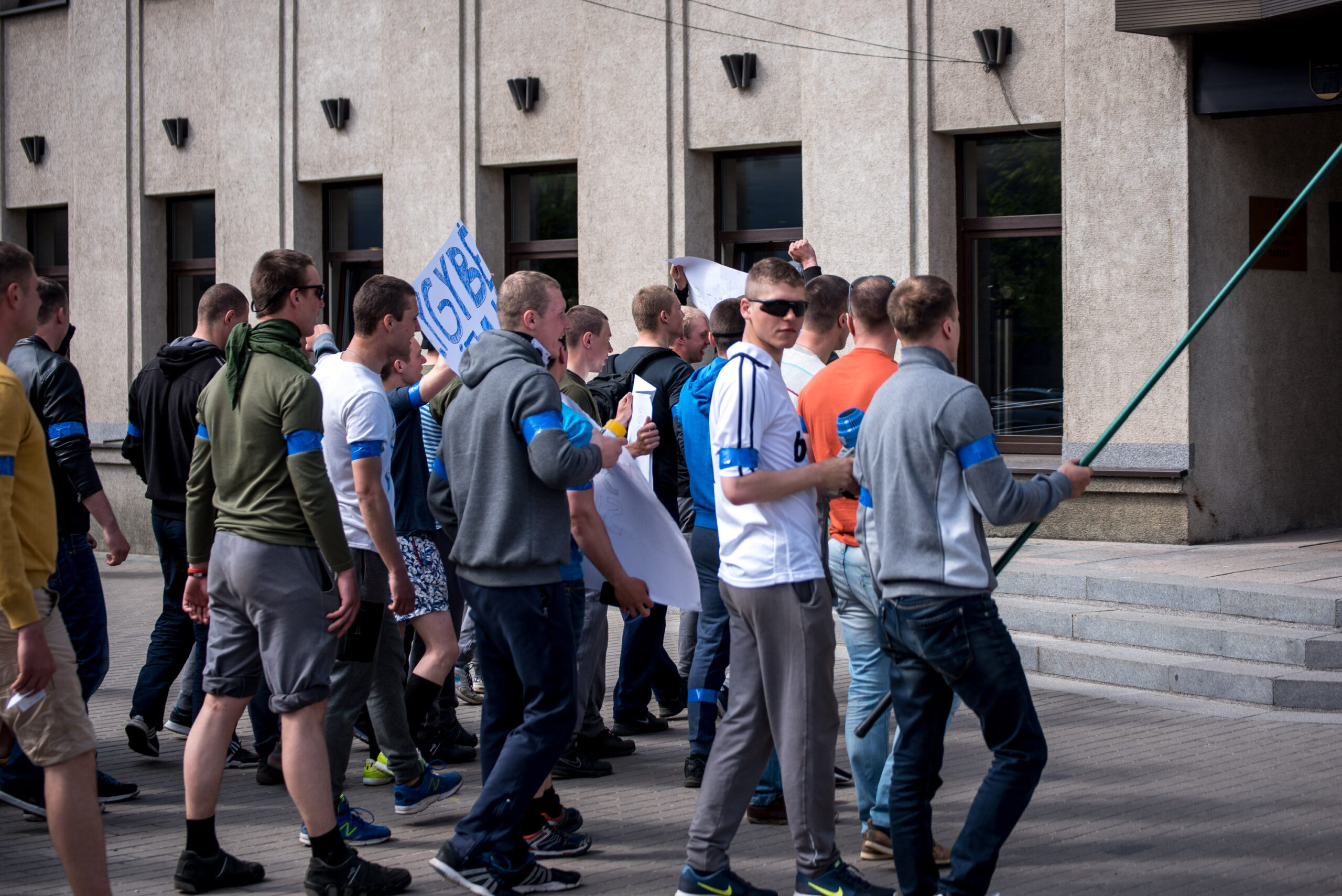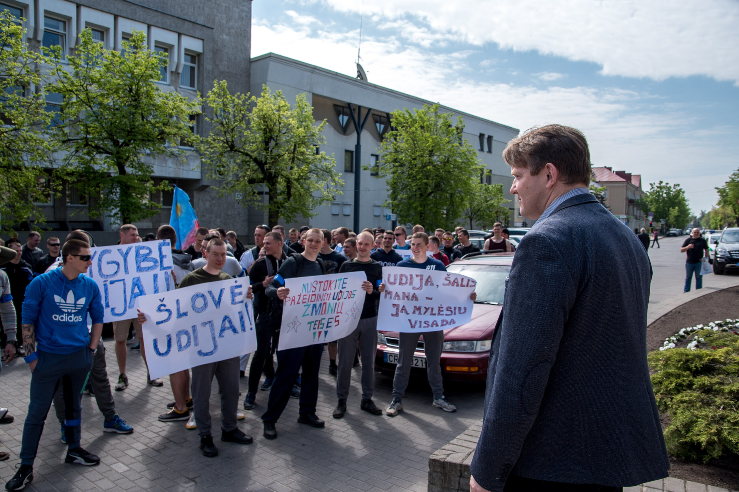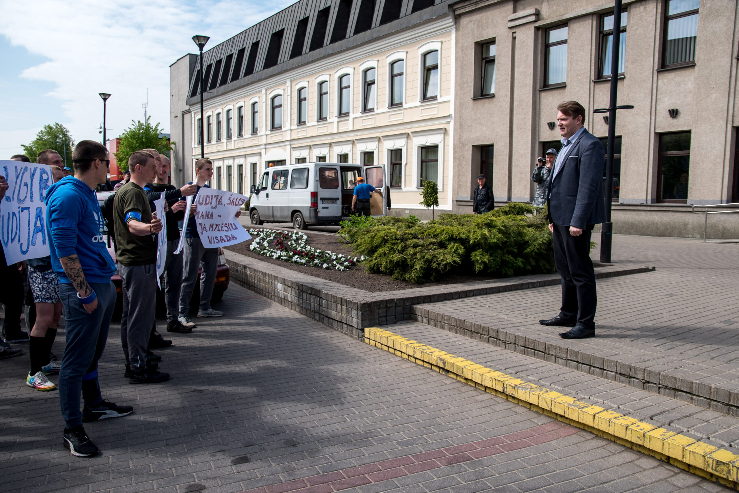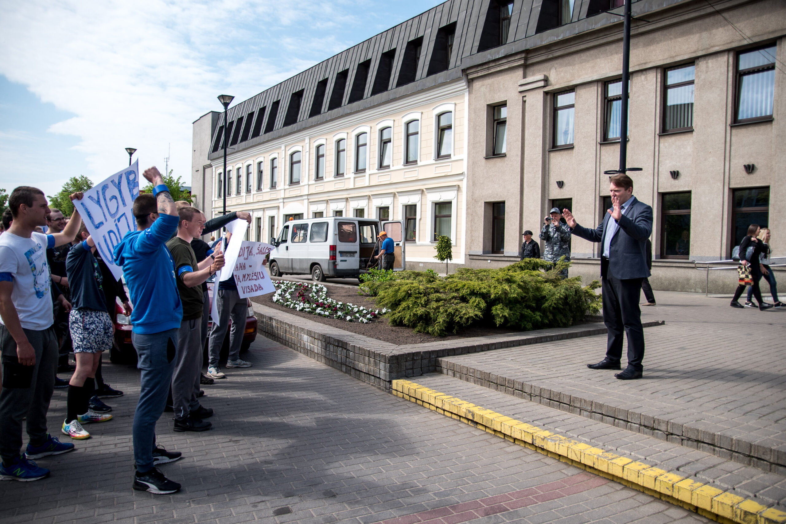 Kelios dešimtys mėlynais raiščiais ant abiejų rankų pasidabinusių vyrų garsiai reiškė savo pasipiktina, reikalavo miesto mero dėmesio ir kurstė nesantaiką. Įsisiautėjusių jaunuolių, vienas po kito, skubėjo raminti mero pavaduotojas Petras Luomanas, savivaldybės administracijos direktoriaus pavaduotojas Tomas Jukna bei kiti savivaldybės darbuotojai, tačiau protestantai vieningai tvirtino, kad kalbės tik su meru. Deja, penktadienio popietę Panevėžio vadovas Rytis Mykolas Račkauskas buvo išvykęs iš miesto, todėl nuraminti besipiktinančius nebuvo lengva.