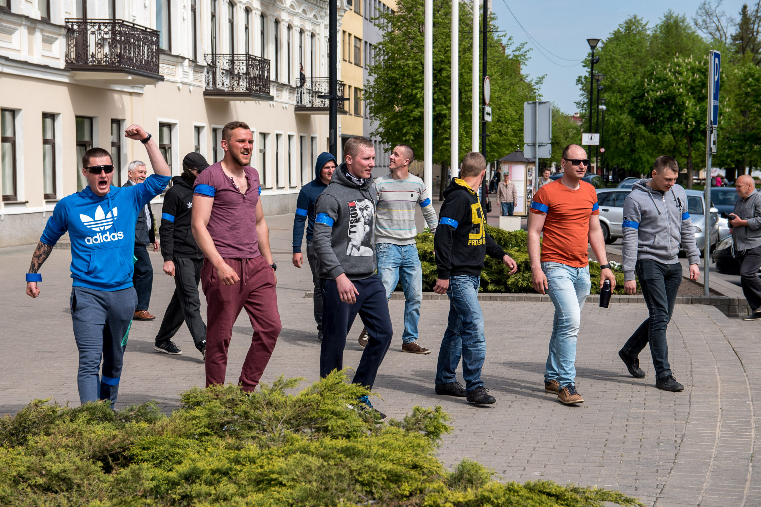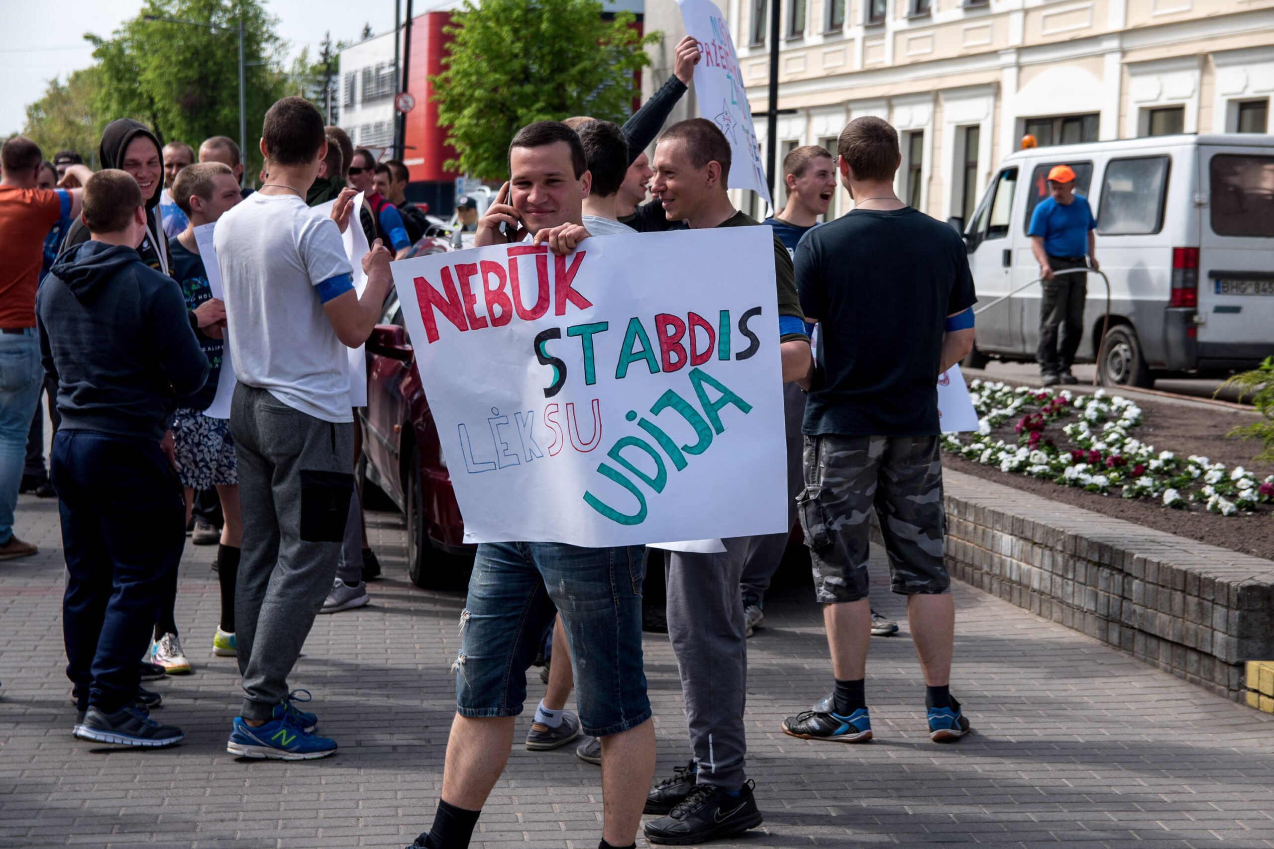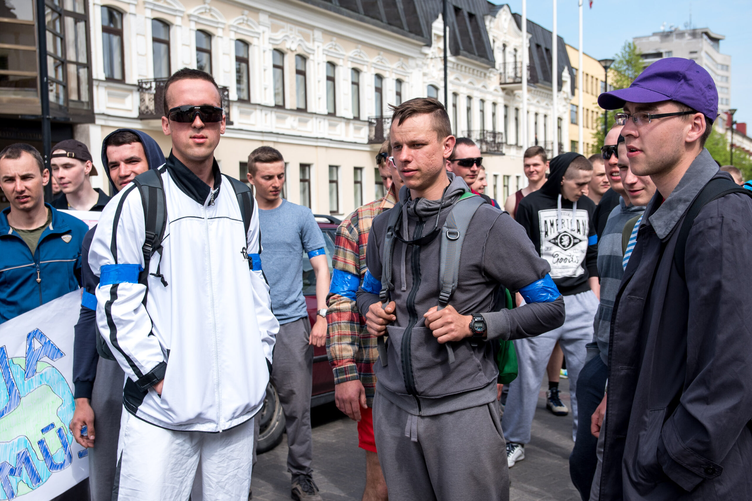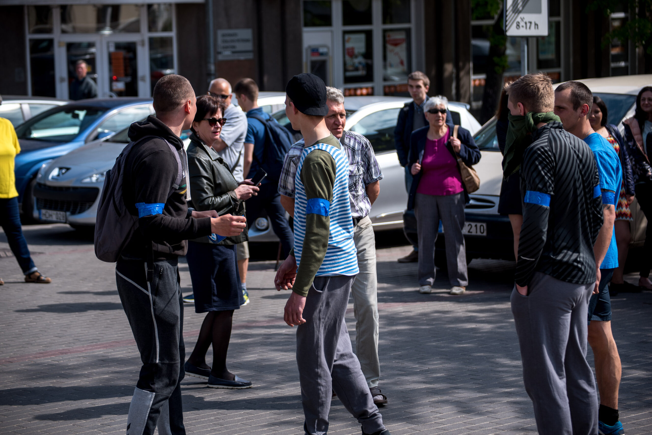 Kelios dešimtys mėlynais raiščiais ant abiejų rankų pasidabinusių vyrų garsiai reiškė savo pasipiktina, reikalavo miesto mero dėmesio ir kurstė nesantaiką. Įsisiautėjusių jaunuolių, vienas po kito, skubėjo raminti mero pavaduotojas Petras Luomanas, savivaldybės administracijos direktoriaus pavaduotojas Tomas Jukna bei kiti savivaldybės darbuotojai, tačiau protestantai vieningai tvirtino, kad kalbės tik su meru. Deja, penktadienio popietę Panevėžio vadovas Rytis Mykolas Račkauskas buvo išvykęs iš miesto, todėl nuraminti besipiktinančius nebuvo lengva.
