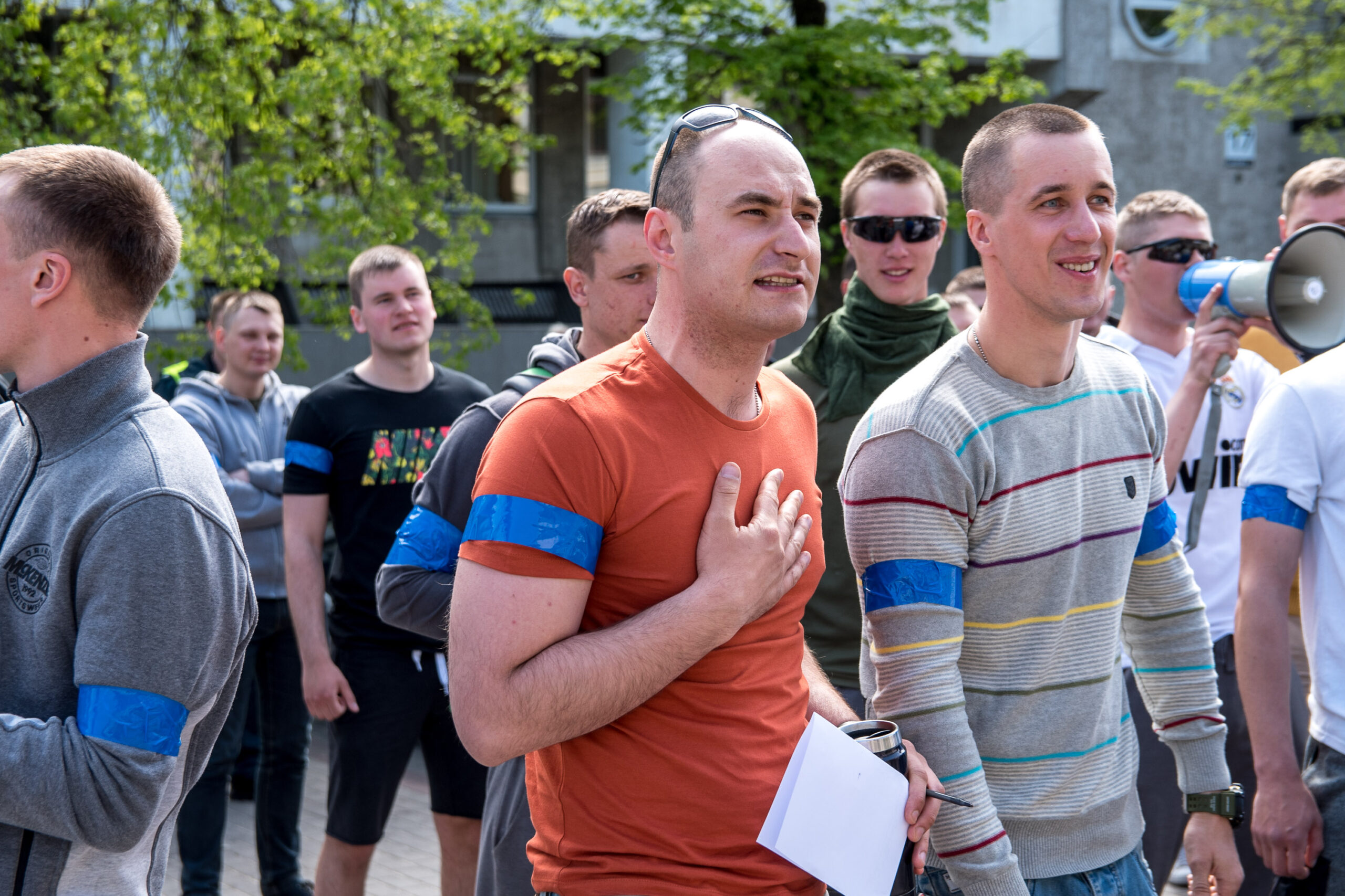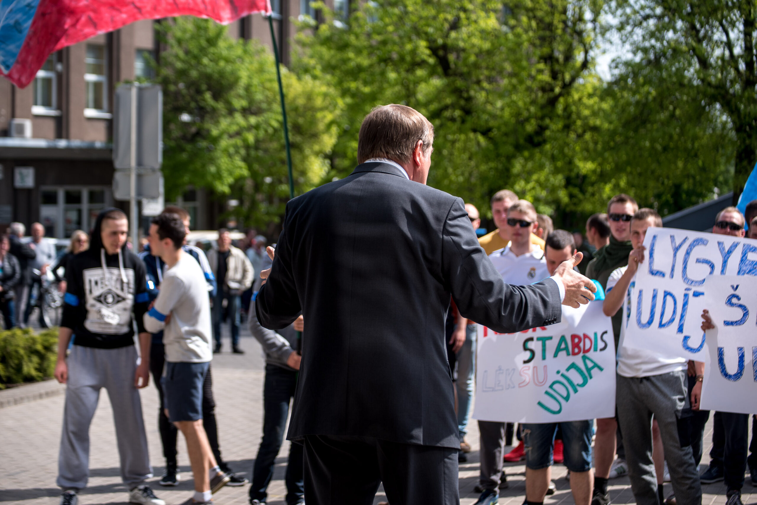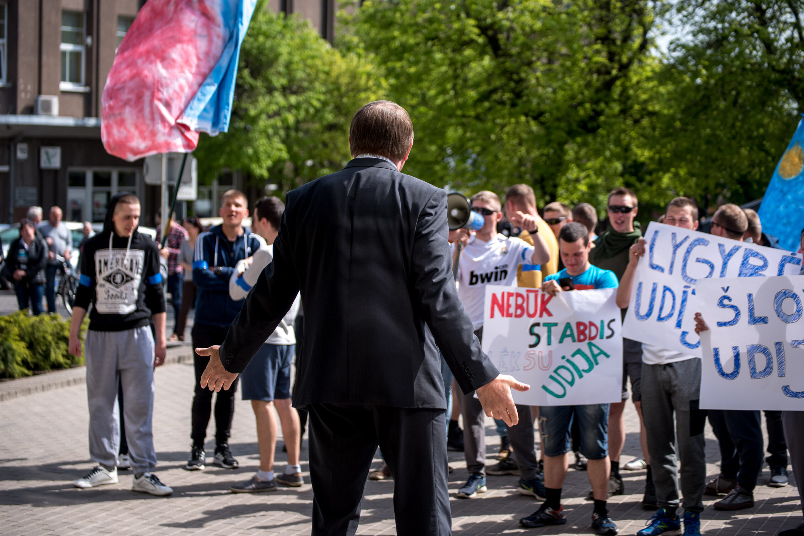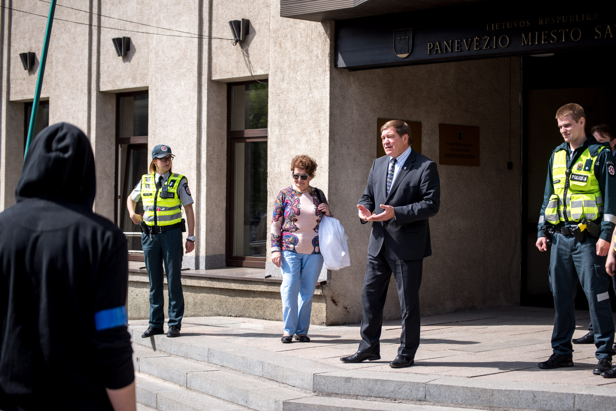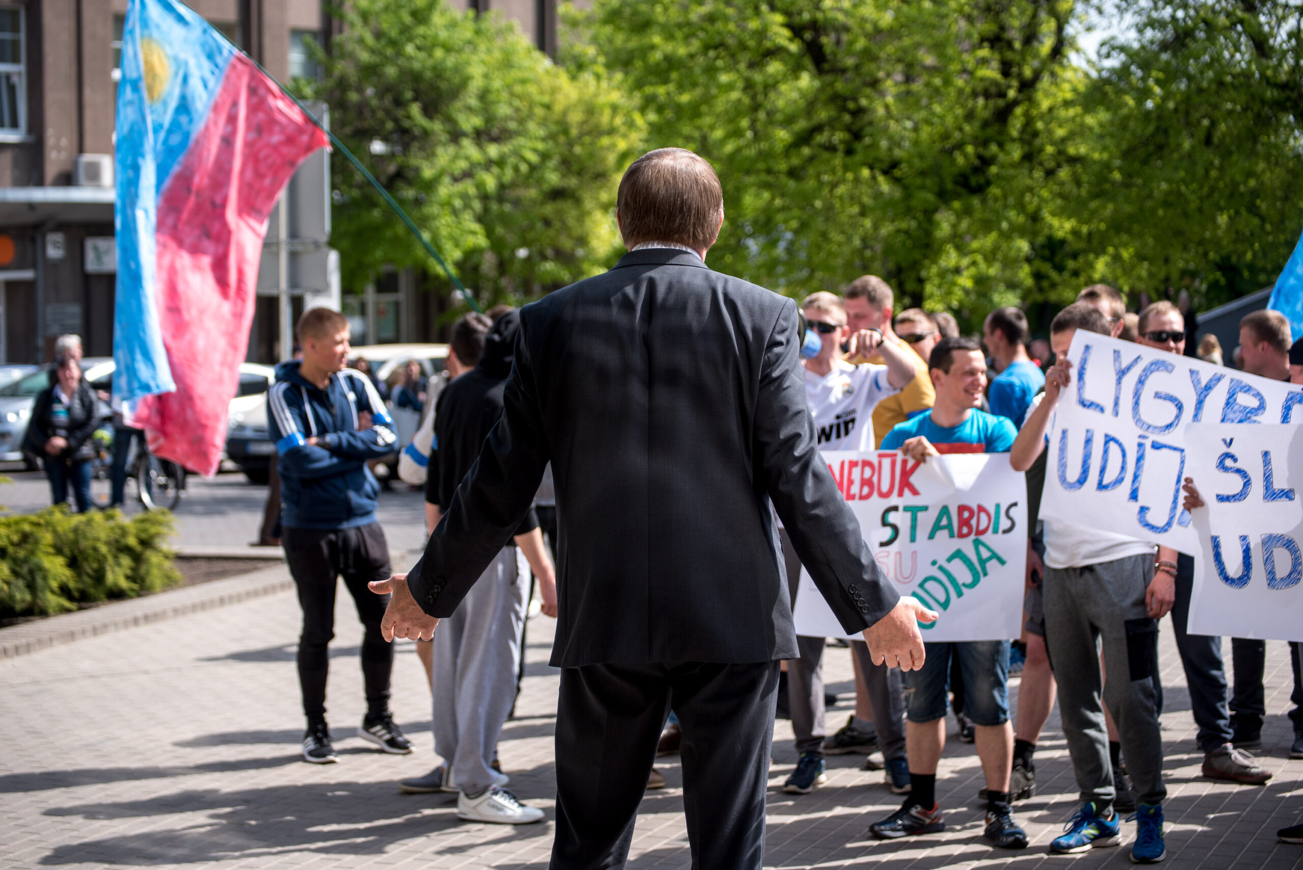 Kelios dešimtys mėlynais raiščiais ant abiejų rankų pasidabinusių vyrų garsiai reiškė savo pasipiktina, reikalavo miesto mero dėmesio ir kurstė nesantaiką. Įsisiautėjusių jaunuolių, vienas po kito, skubėjo raminti mero pavaduotojas Petras Luomanas, savivaldybės administracijos direktoriaus pavaduotojas Tomas Jukna bei kiti savivaldybės darbuotojai, tačiau protestantai vieningai tvirtino, kad kalbės tik su meru. Deja, penktadienio popietę Panevėžio vadovas Rytis Mykolas Račkauskas buvo išvykęs iš miesto, todėl nuraminti besipiktinančius nebuvo lengva.