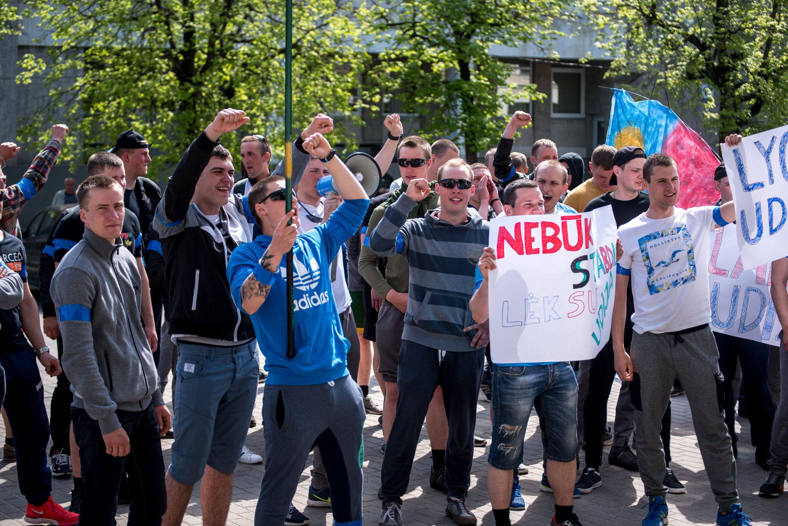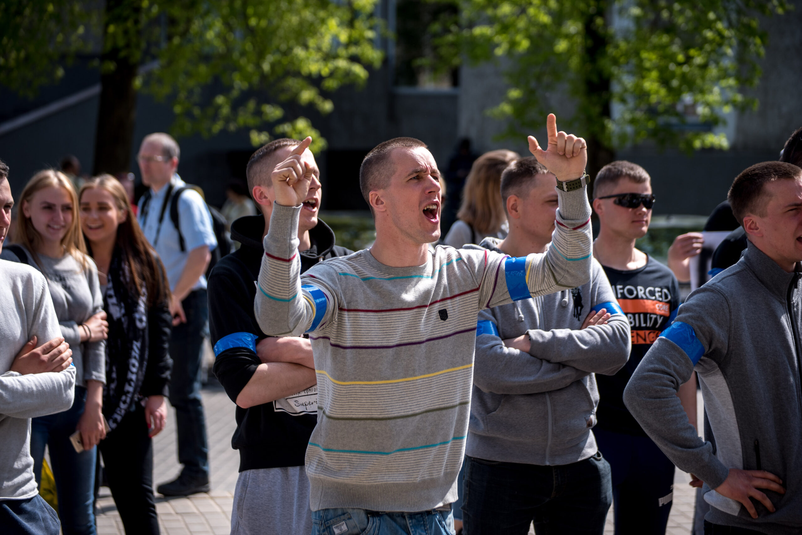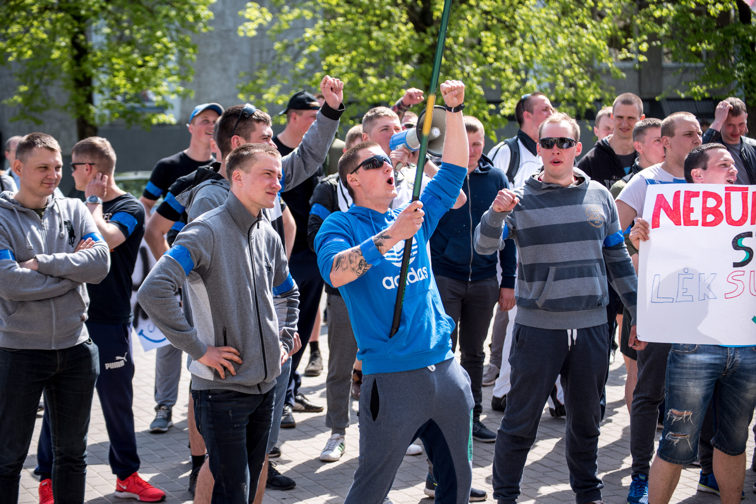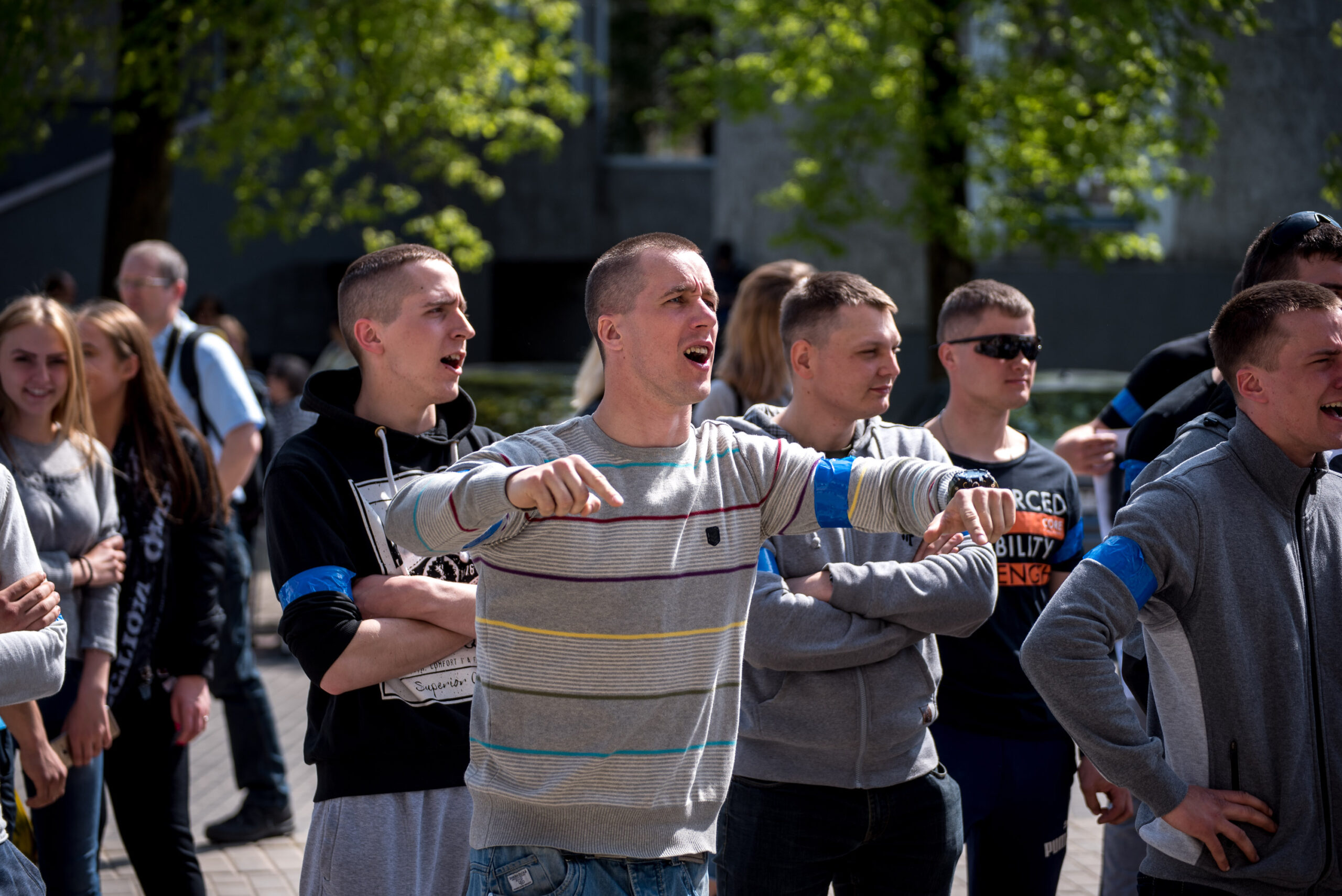 Kelios dešimtys mėlynais raiščiais ant abiejų rankų pasidabinusių vyrų garsiai reiškė savo pasipiktina, reikalavo miesto mero dėmesio ir kurstė nesantaiką. Įsisiautėjusių jaunuolių, vienas po kito, skubėjo raminti mero pavaduotojas Petras Luomanas, savivaldybės administracijos direktoriaus pavaduotojas Tomas Jukna bei kiti savivaldybės darbuotojai, tačiau protestantai vieningai tvirtino, kad kalbės tik su meru. Deja, penktadienio popietę Panevėžio vadovas Rytis Mykolas Račkauskas buvo išvykęs iš miesto, todėl nuraminti besipiktinančius nebuvo lengva.
