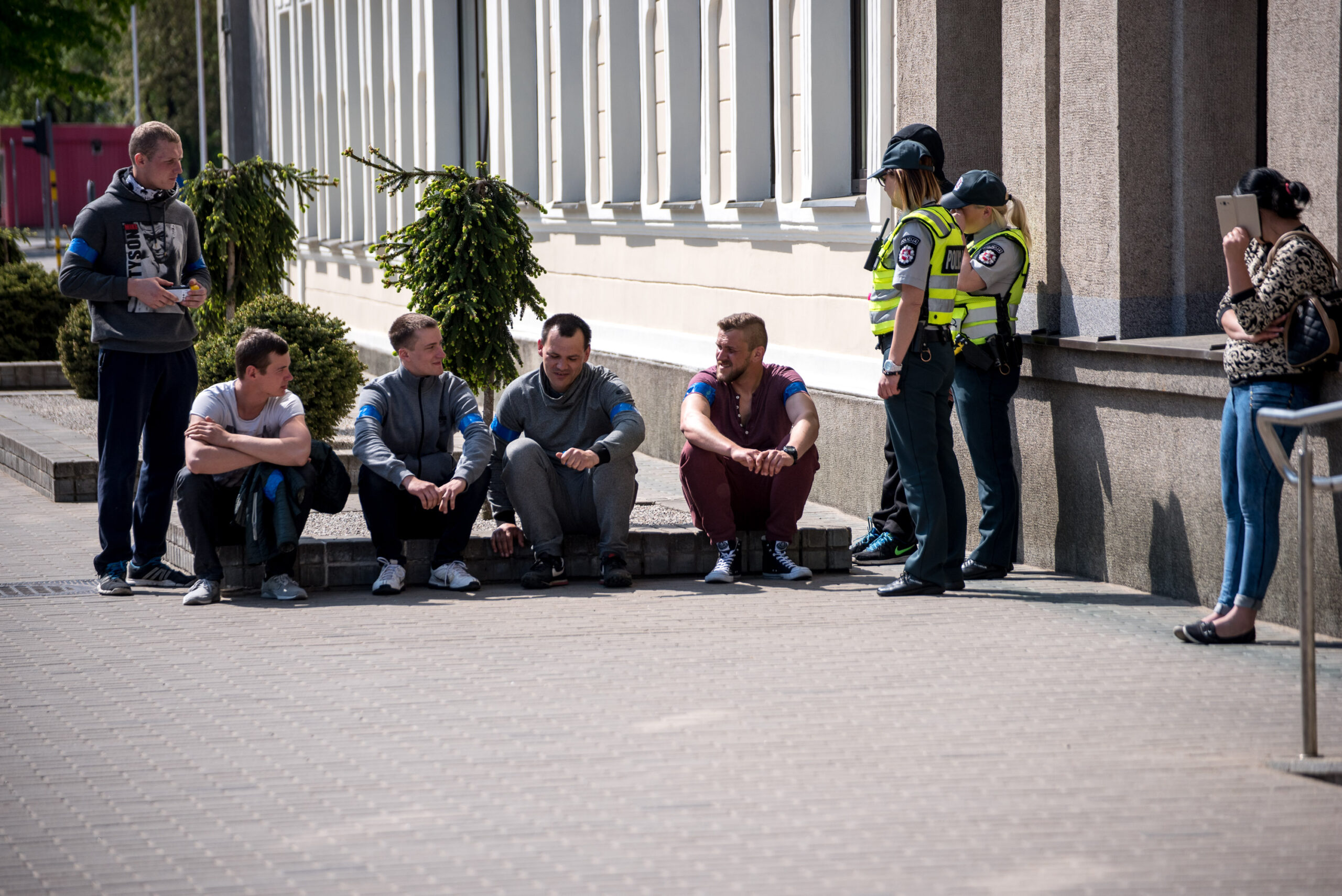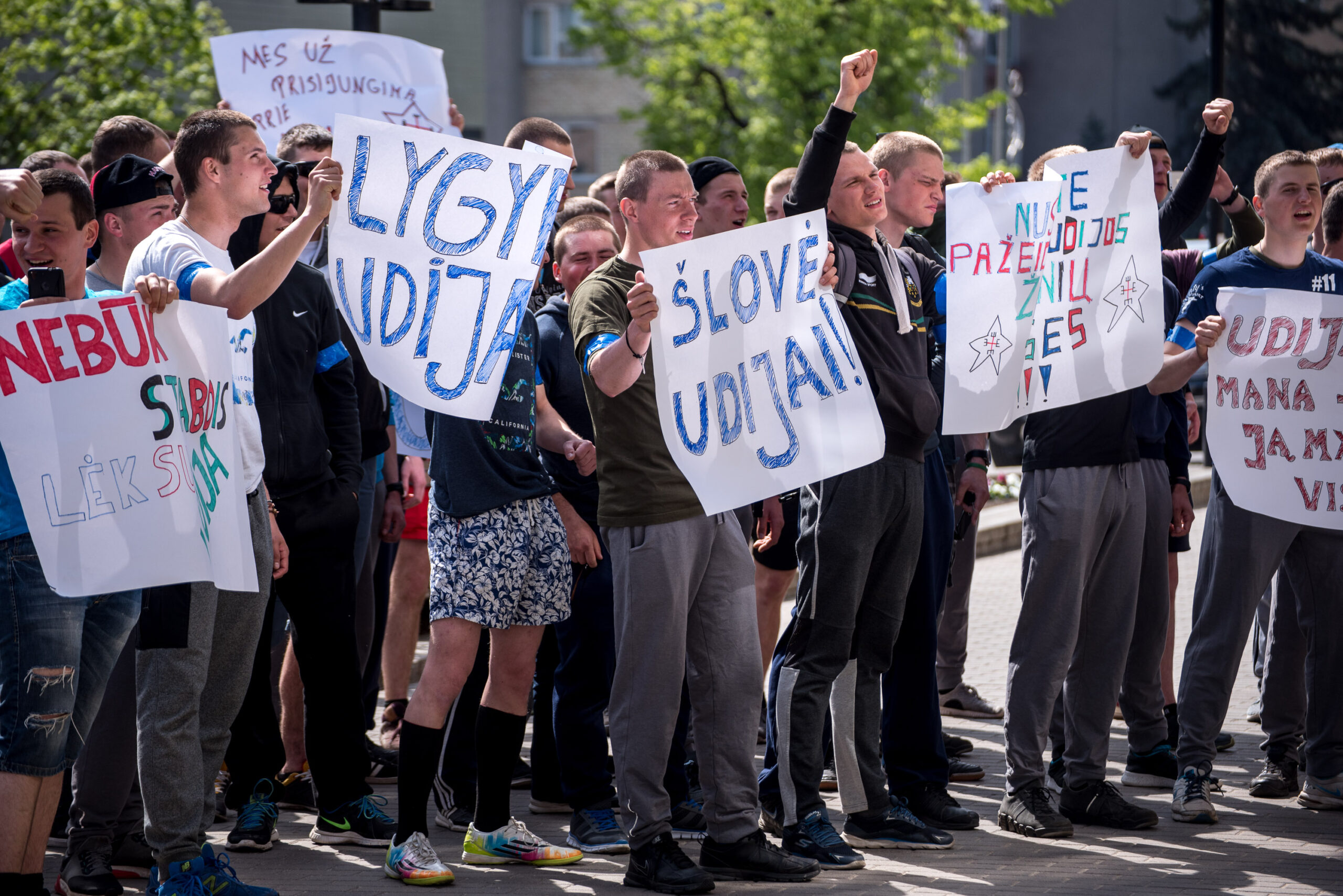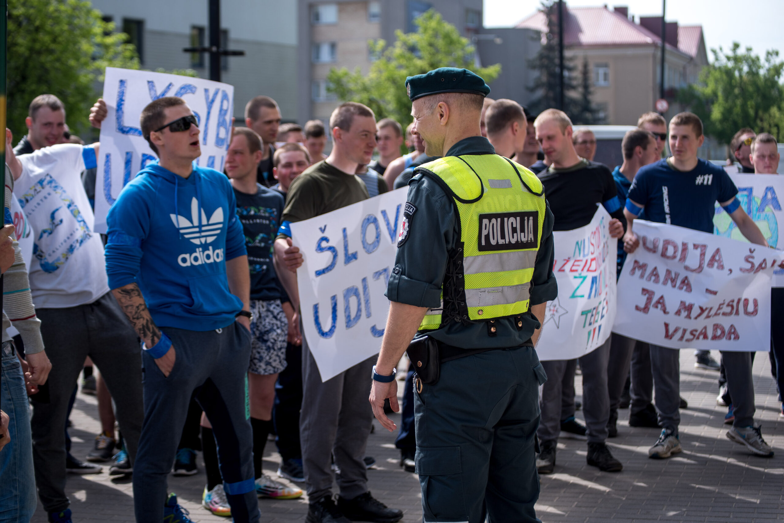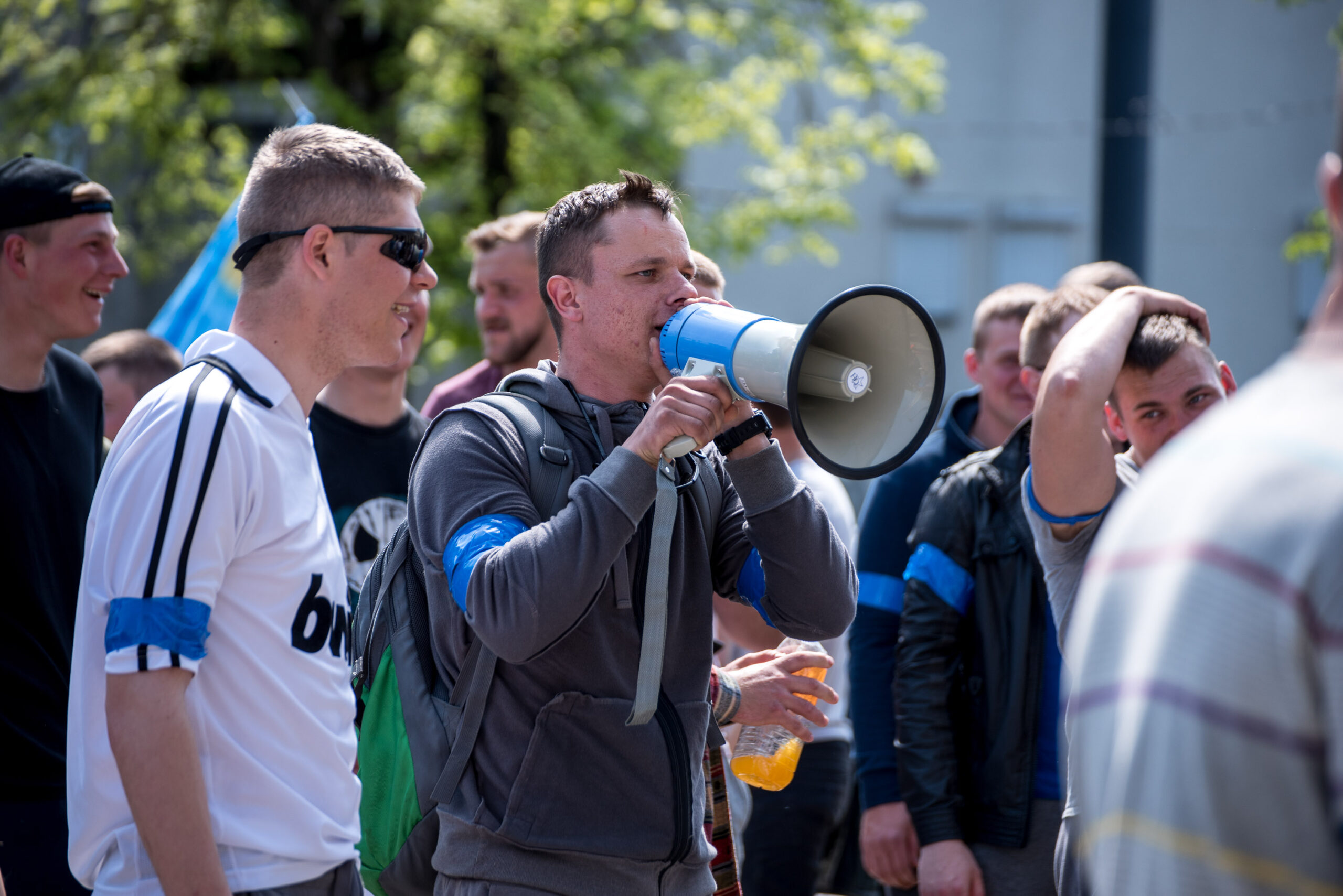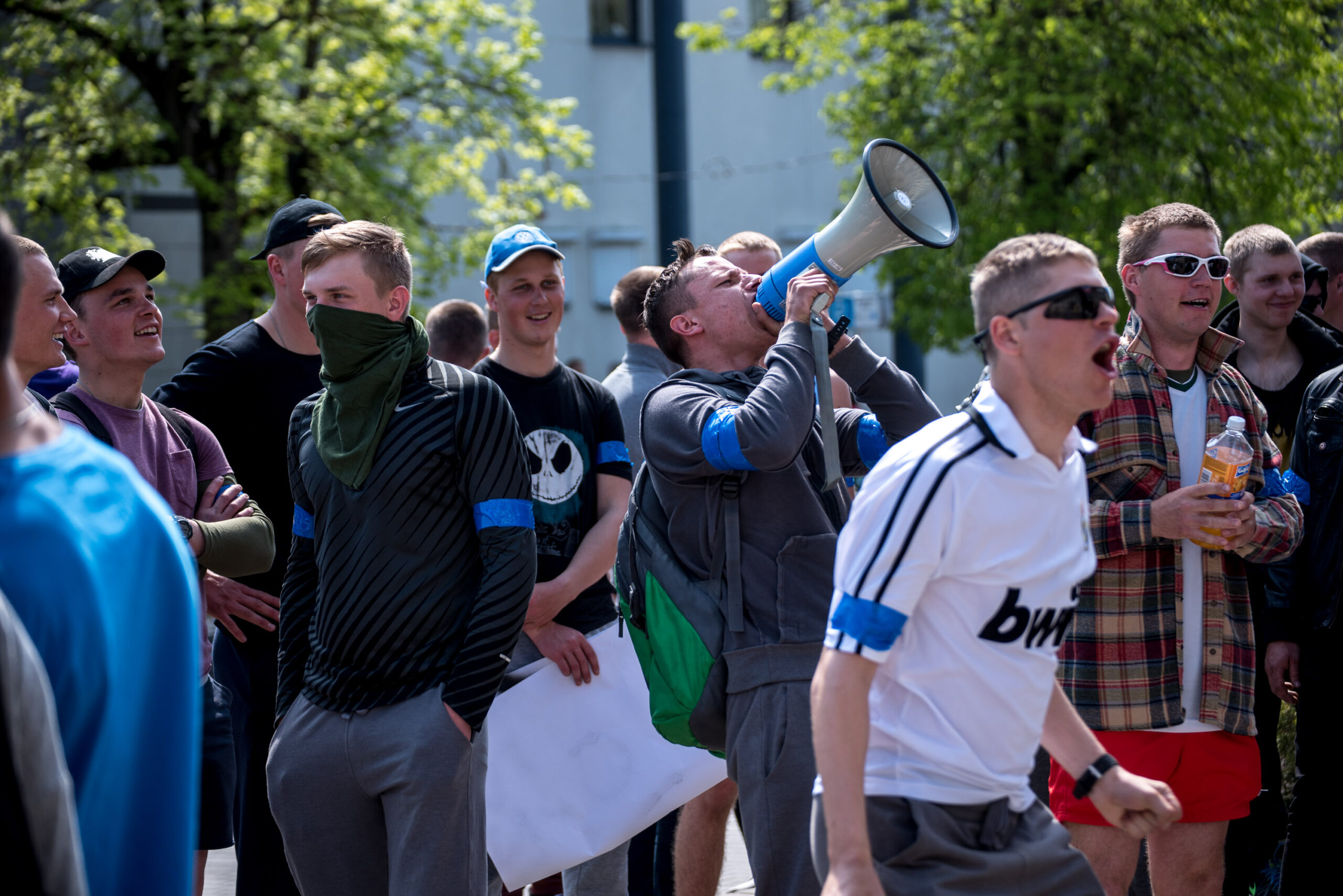 Kelios dešimtys mėlynais raiščiais ant abiejų rankų pasidabinusių vyrų garsiai reiškė savo pasipiktina, reikalavo miesto mero dėmesio ir kurstė nesantaiką. Įsisiautėjusių jaunuolių, vienas po kito, skubėjo raminti mero pavaduotojas Petras Luomanas, savivaldybės administracijos direktoriaus pavaduotojas Tomas Jukna bei kiti savivaldybės darbuotojai, tačiau protestantai vieningai tvirtino, kad kalbės tik su meru. Deja, penktadienio popietę Panevėžio vadovas Rytis Mykolas Račkauskas buvo išvykęs iš miesto, todėl nuraminti besipiktinančius nebuvo lengva.