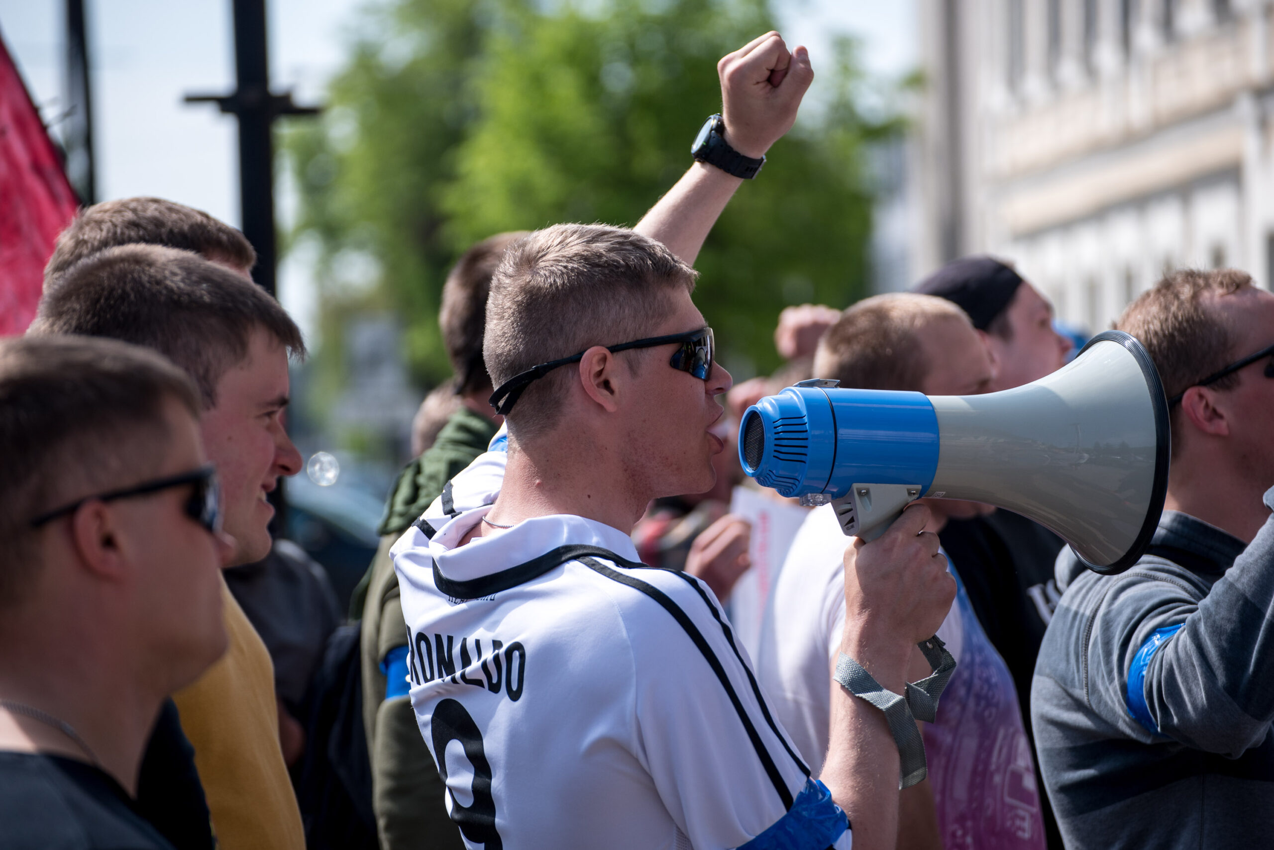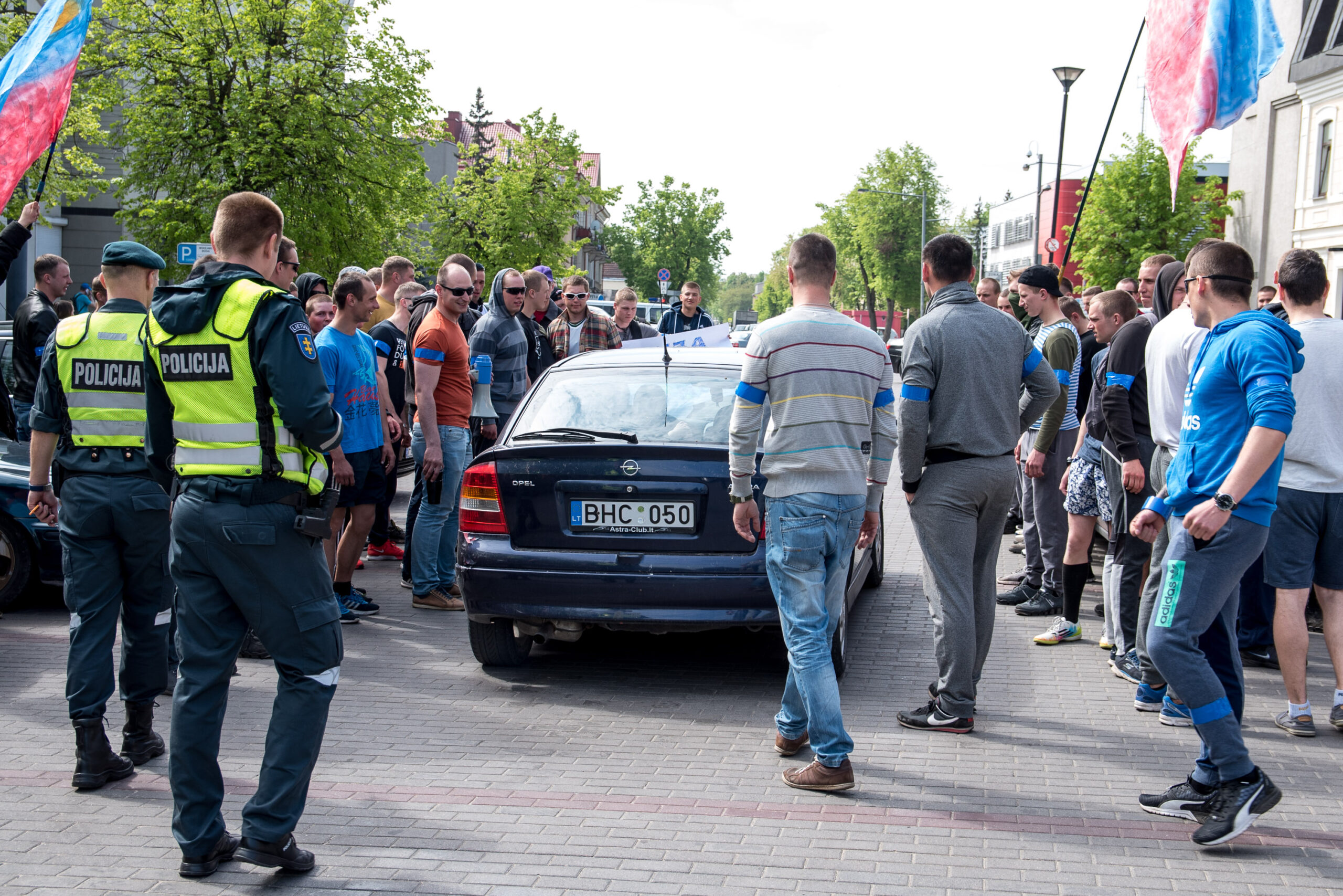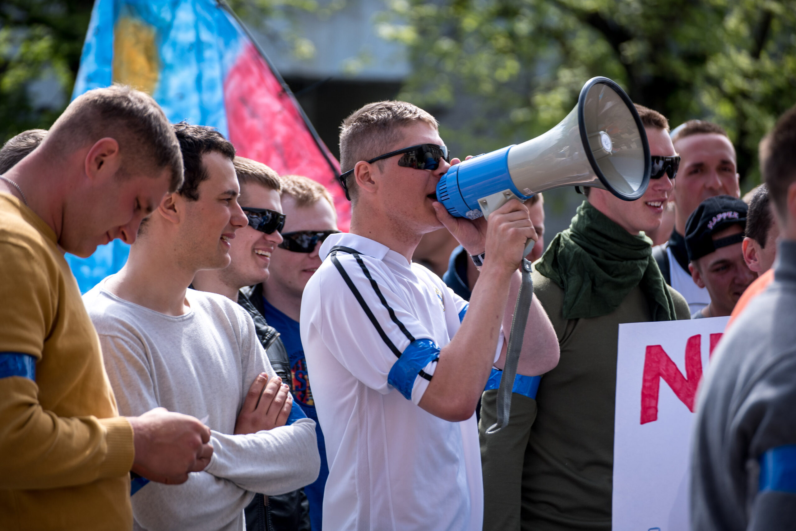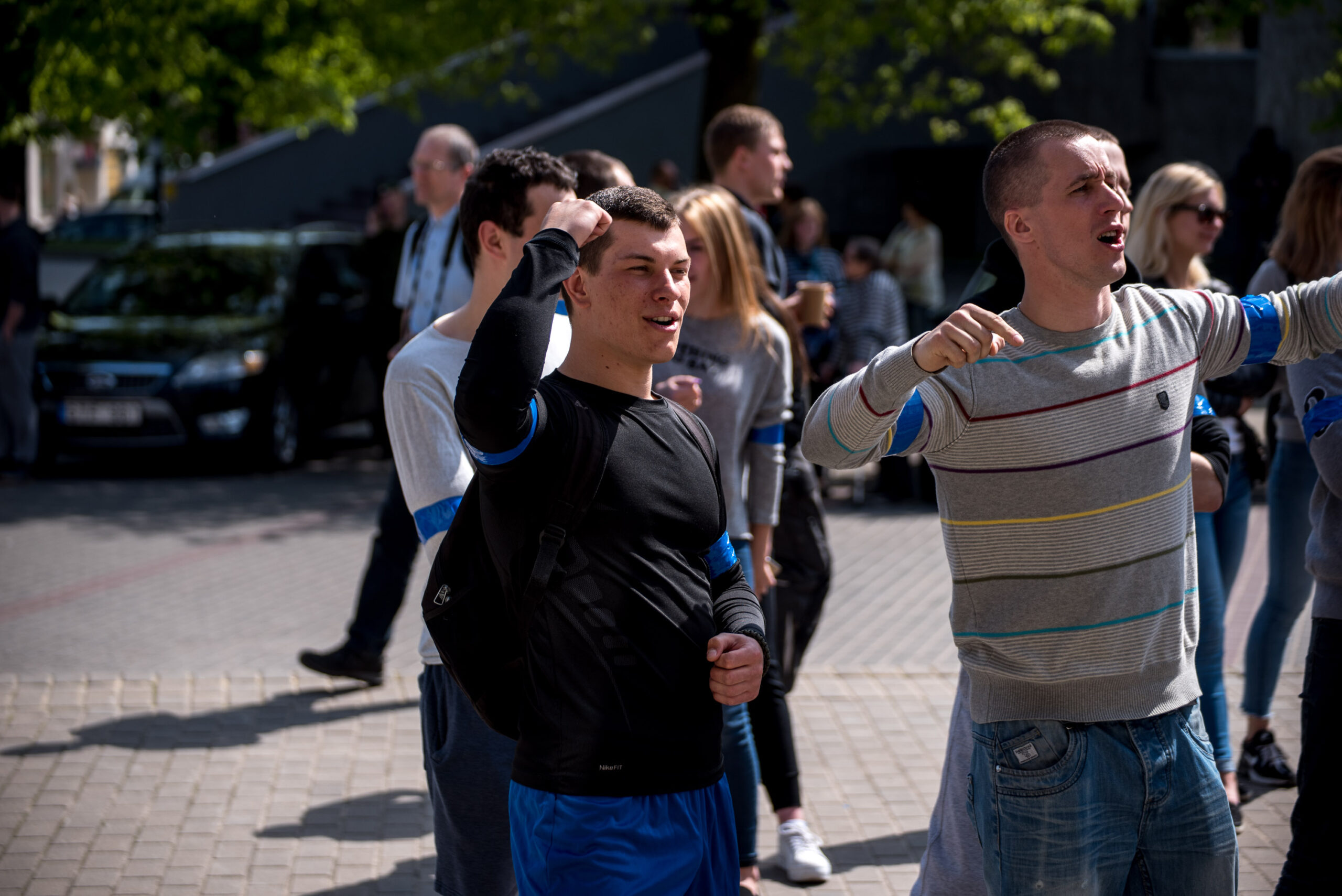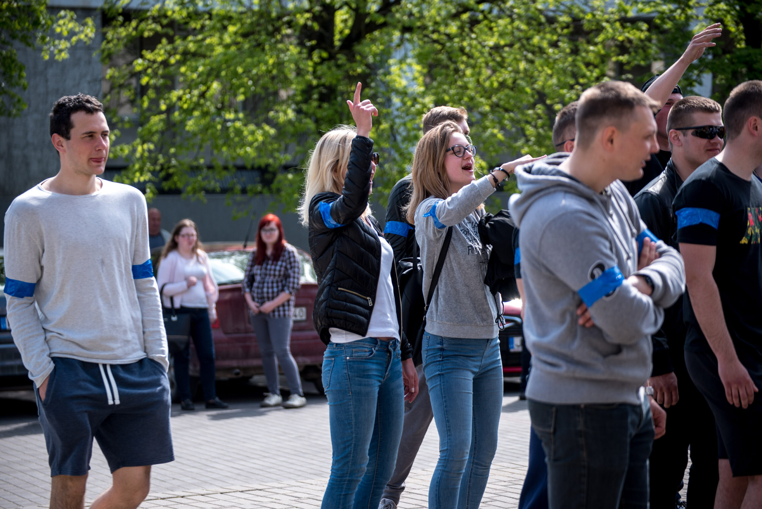 Kelios dešimtys mėlynais raiščiais ant abiejų rankų pasidabinusių vyrų garsiai reiškė savo pasipiktina, reikalavo miesto mero dėmesio ir kurstė nesantaiką. Įsisiautėjusių jaunuolių, vienas po kito, skubėjo raminti mero pavaduotojas Petras Luomanas, savivaldybės administracijos direktoriaus pavaduotojas Tomas Jukna bei kiti savivaldybės darbuotojai, tačiau protestantai vieningai tvirtino, kad kalbės tik su meru. Deja, penktadienio popietę Panevėžio vadovas Rytis Mykolas Račkauskas buvo išvykęs iš miesto, todėl nuraminti besipiktinančius nebuvo lengva.