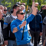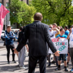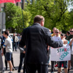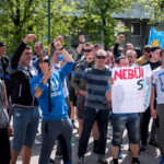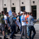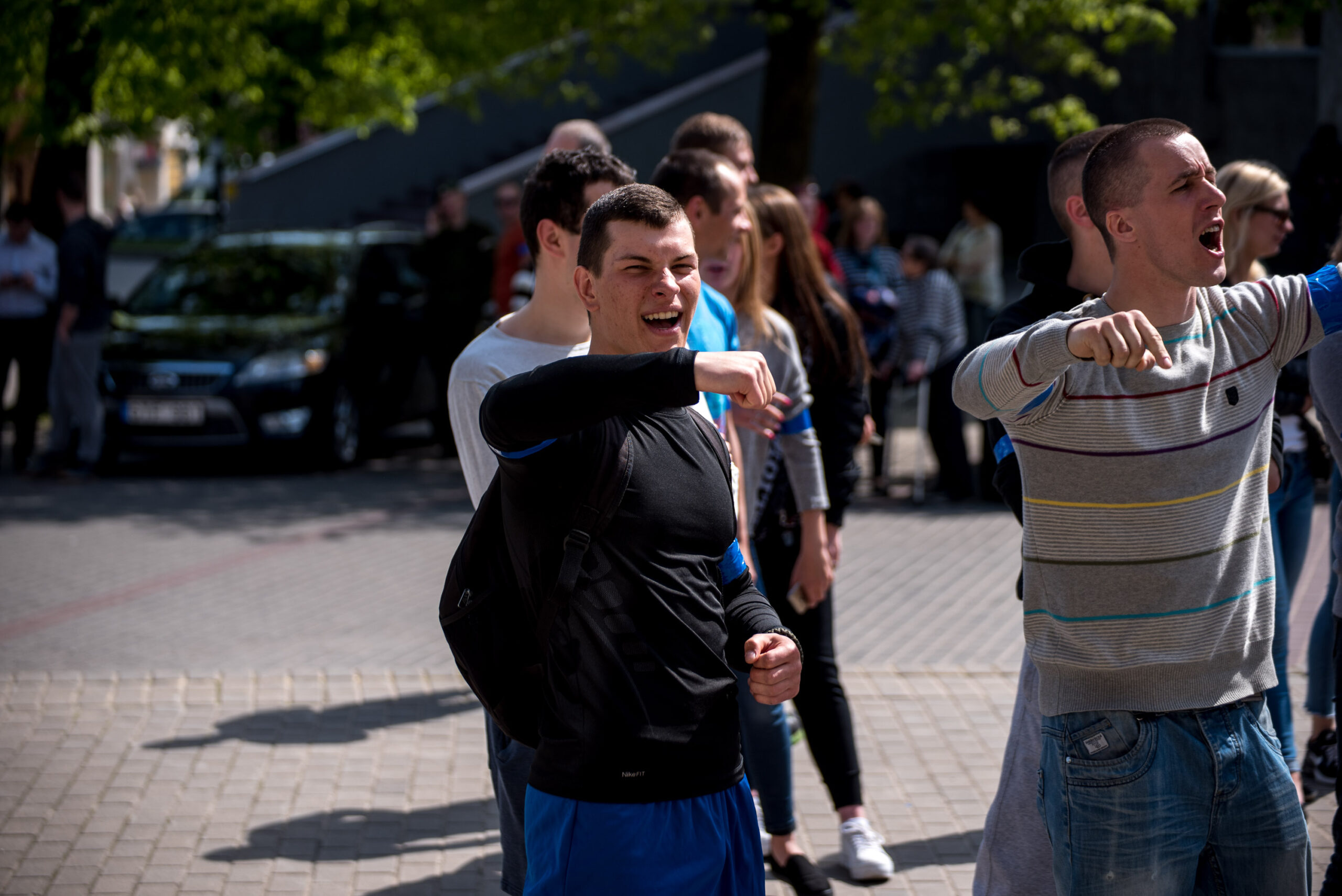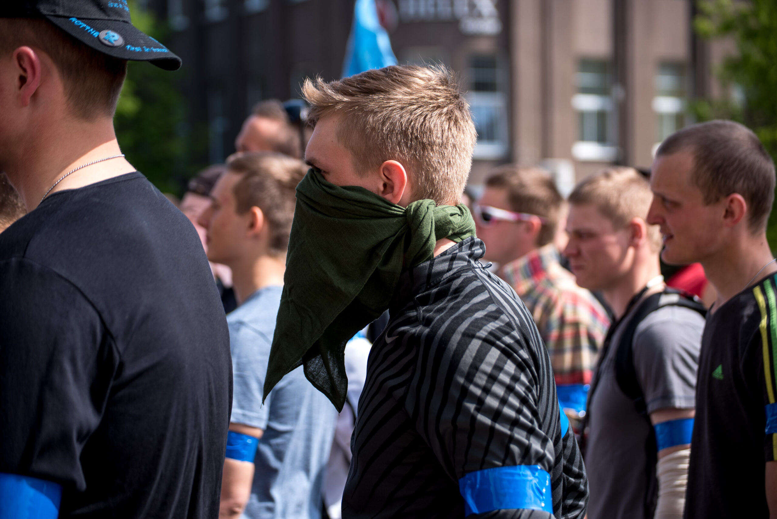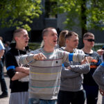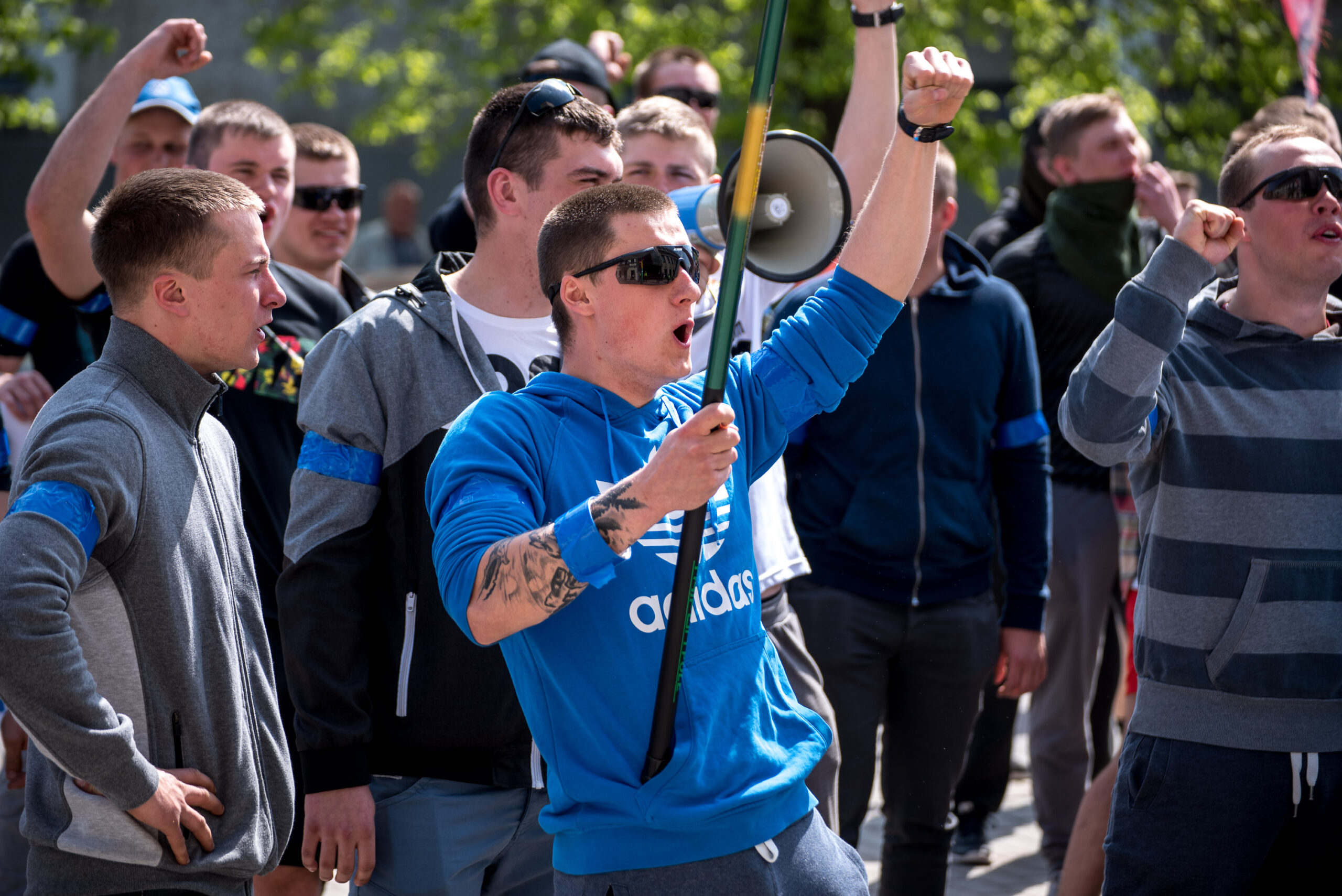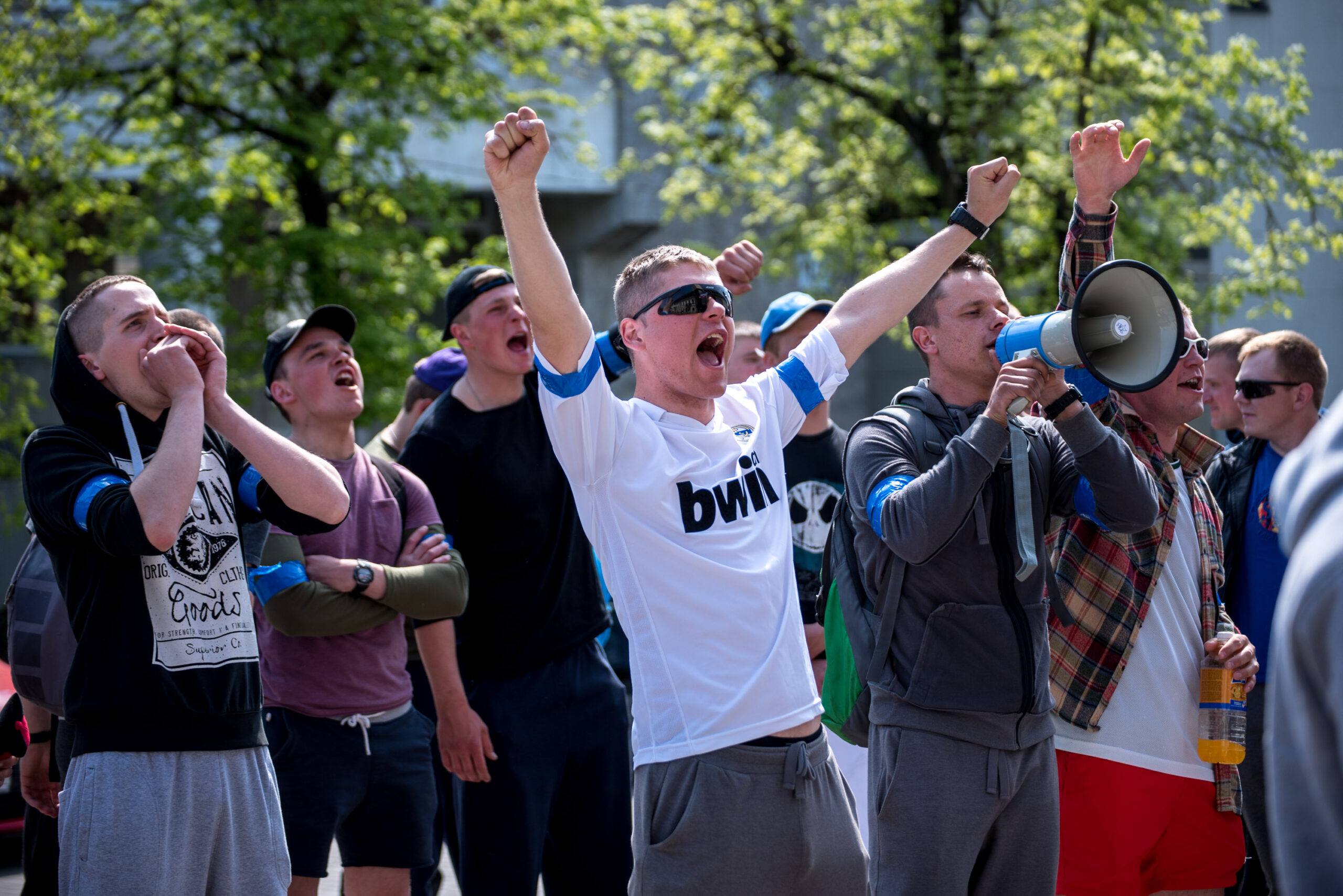 Kelios dešimtys mėlynais raiščiais ant abiejų rankų pasidabinusių vyrų garsiai reiškė savo pasipiktina, reikalavo miesto mero dėmesio ir kurstė nesantaiką. Įsisiautėjusių jaunuolių, vienas po kito, skubėjo raminti mero pavaduotojas Petras Luomanas, savivaldybės administracijos direktoriaus pavaduotojas Tomas Jukna bei kiti savivaldybės darbuotojai, tačiau protestantai vieningai tvirtino, kad kalbės tik su meru. Deja, penktadienio popietę Panevėžio vadovas Rytis Mykolas Račkauskas buvo išvykęs iš miesto, todėl nuraminti besipiktinančius nebuvo lengva.