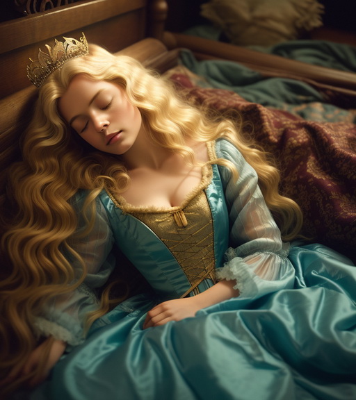 Įsidūrusi pirštą užkerėtos verpstės smaigaliu, Aurora užmiega 100 metų miegu, kurį nutraukti tegali tikros meilės bučinys.