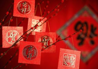 Naujųjų metų išvakarėse Kinijoje vyksta pats populiariausias toje šalyje ritualas. Kinai tiki, kad laimė ateina tiesiai pro duris. Tad tą dieną ant namo durų priklijuojamas iš raudono popieriaus iškirptas kvadratas, o ant jo parašytas hieroglifas „fu“ – „laimė“. Kvadratas su hieroglifu priklijuojamas apverstas. Kodėl? Ogi todėl, kad posakis „aukštyn kojomis“ ir žodis „ateik“ kinų kalba skamba vienodai. Taigi apversti „laimės“ hieroglifą – tas pats, kas kviesti: „Laime, ateik!“ Ir ši būtinai ateis, tuo kinai šventai tiki.