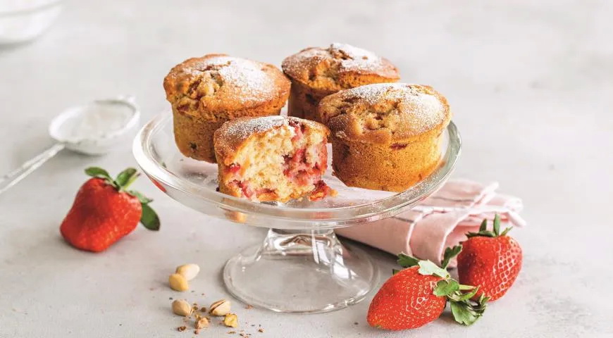 Reikės (6 porcijoms): 180 g miltų, 130 g cukraus, 100 g sviesto, 3 kiaušinių, 150 g braškių, saujos pistacijų branduolių, 7 g kepimo miltelių, 0,5 šaukštelio šviežiai maltų juodųjų pipirų, žiupsnelio druskos, sviesto formoms sutepti.