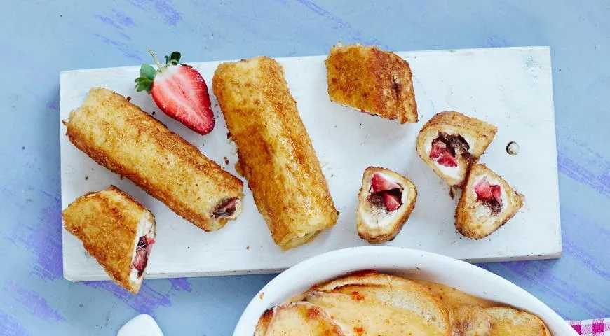 Reikės (2 porcijoms): 200 g braškių, 8 riekių baltos duonos skrudinti, maskarponės (ar kito kreminio sūrio), šokolado plytelės, 2 kiaušinių, sviesto, smulkaus rudojo cukraus.