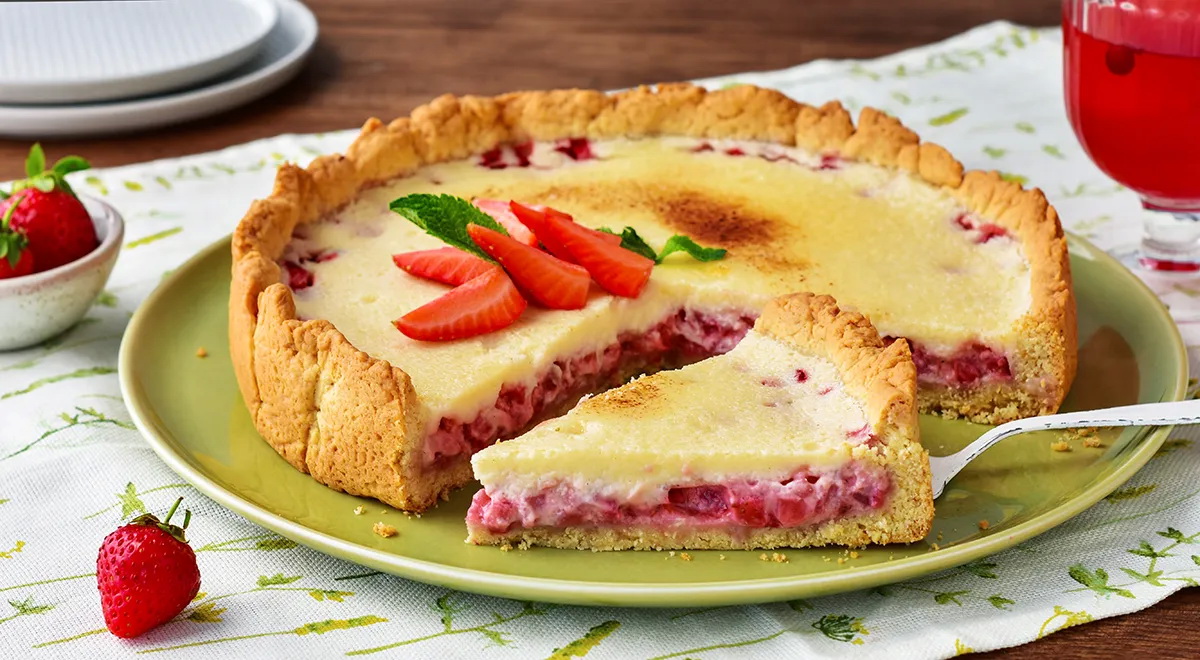 Reikės (8 porcijoms): užpilui ir įdarui: 500 g braškių, 2 kiaušinių, 160 g cukraus, 1 šaukštelio vanilinio cukraus, 370 g grietinės (30 proc.), 25 g kukurūzų krakmolo; tešlai: 280 g miltų, druskos ant peilio galiuko, 10 g kepimo miltelių, 100 g sviesto 1 kiaušinio, 50 g cukraus, 50 g grietinės (20 proc.).