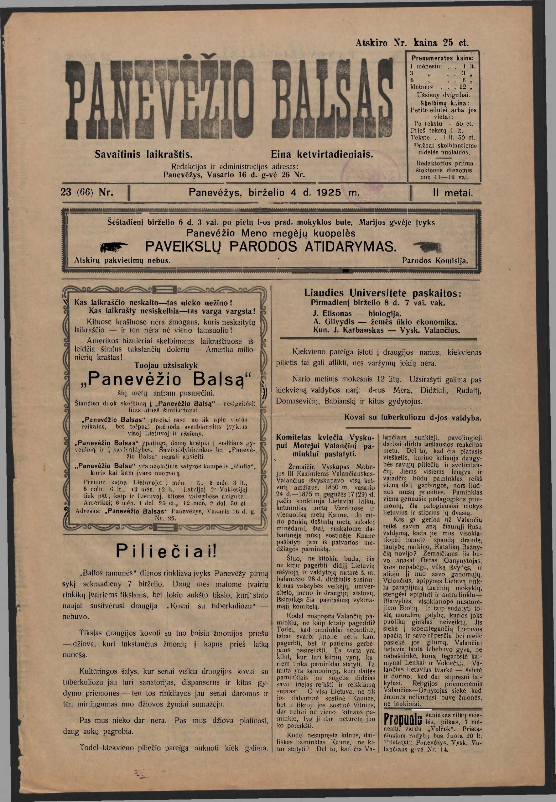 „Girdėjau, kad Tamsta ar Tamstos leidžiate pirmą „Panevėžio Balsas“ numerį. Tegul Dievas jums padeda gyventi toje ašarų pakalnėje, nieko be reikalo nebarti, bet netylėti ką nors bloga pamačius. Gerai būtų, kad ir Tamstos, p. Redaktoriau, niekas nebartų, be reikalo kalėjiman nesodintų ir kad nereikėtų elgetauti išmaldą padengimui administratyvinio nutarimo. Linkėčiau Tamstai nesikarščiuoti ir žengti pirmyn iš palengvo, nesidairant nei į partijas, nei į atskiras sroves bei nuomones. Drožk tiesiai ir gana!“