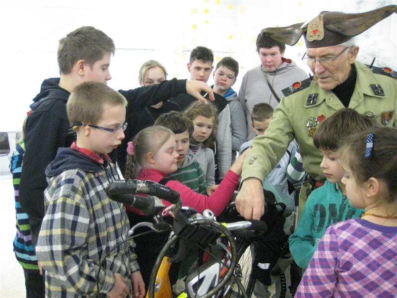 Baigdamas aktyviausius klausytojus apdovanojo atšvaitais, įvairiais lankstinukais. Vaikai, pastebėję, kad dviratininkas jau baigė pasakoti, apstojo ratu ir matavosi svečio kepurę, išbandė signalą, stabdžius, čiupinėjo originalius medalius bei kitas smulkmenas.
