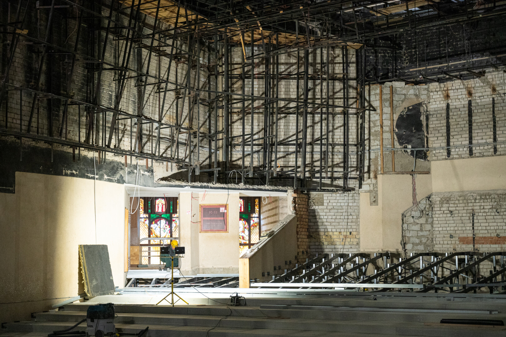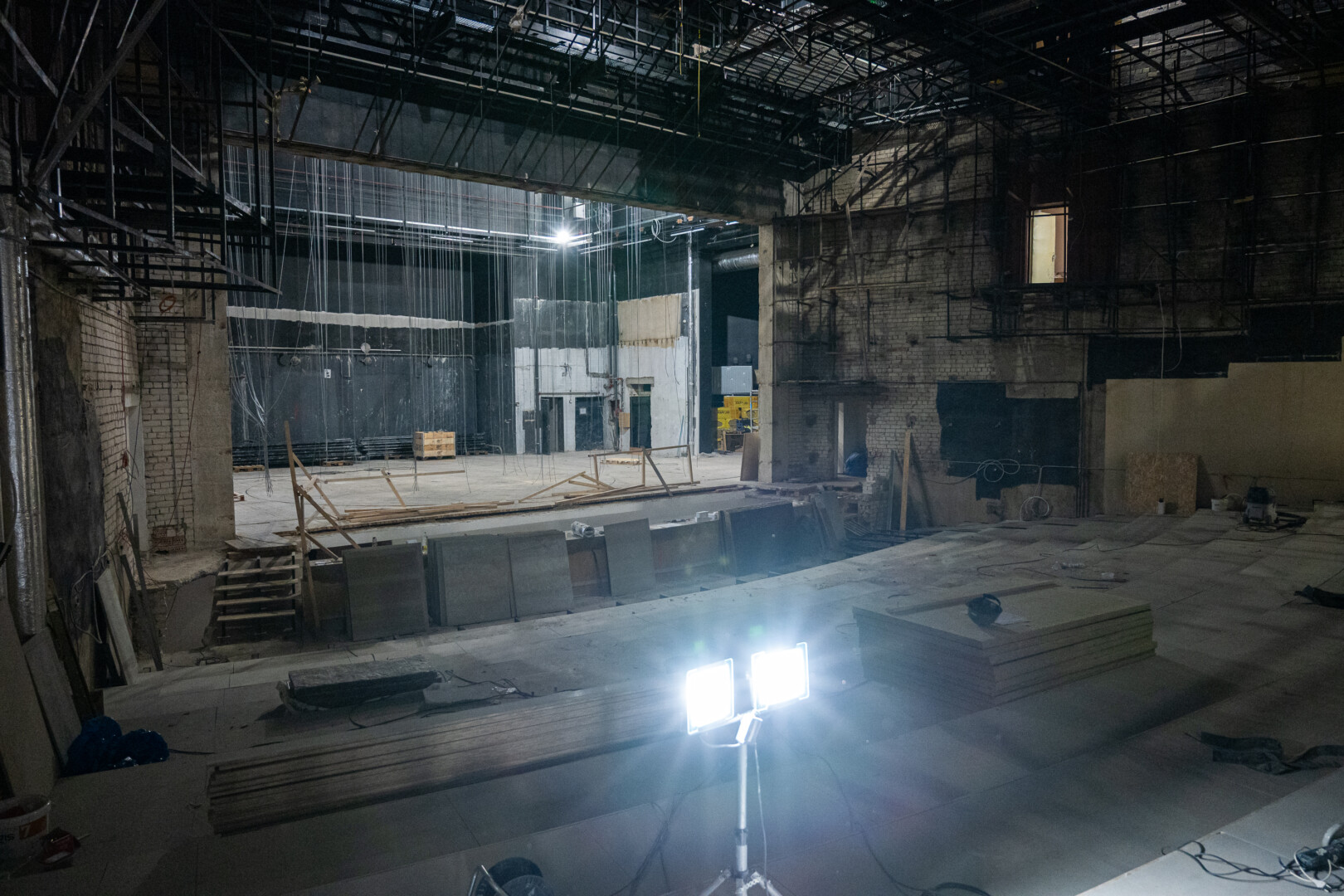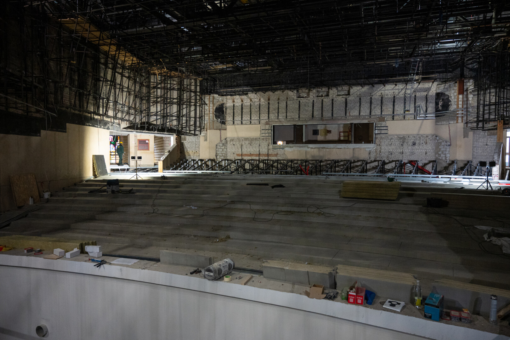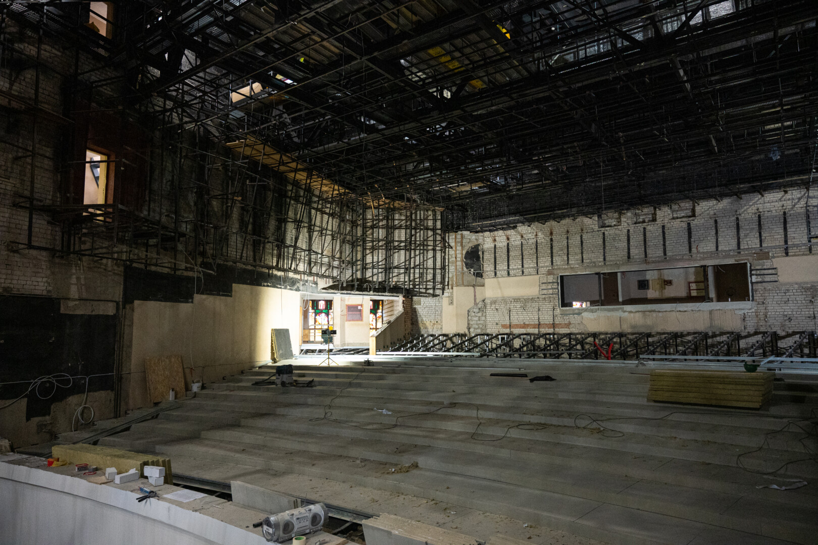 Pirmiausia išmontuota ir didžiosios salės, ir scenos įranga, tas pats padaryta ir pradėjus remontuoti grimo, persirengimo, repeticijų kambarius.