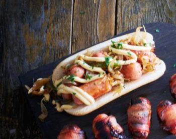 Reikės (4 porcijoms): 12 mini dešrelių, 2 žaliųjų Chalapos paprikų, 1 svogūno, 3 česnako skiltelių, 4 bandelių dešrainiams, druskos, pipirų, aliejaus, pirktinio sūrio padažo.