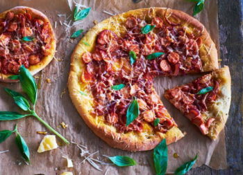 Reikės (4 porcijoms): 2 česnako skiltelių, 1 didelio raudonojo svogūno, 50–70 g konservuotų pomidorų gabalėlių savose sultyse, gatavo picos pagrindo (25 cm skersmens), 3–4 virtų dešrelių (geriau, kad visos būtų skirtingų rūšių), 50 g tarkuoto kietojo sūrio, 1 šaukštelio cukraus, druskos, šviežiai maltų juodųjų pipirų, alyvuogių aliejaus, bazilikų – papuošti.