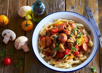 Ragu su dešrelėmis, pievagrybiais ir alyvuogėmis