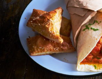 Ant miltais apiberto paviršiaus plonai iškočiokite tešlą, lakštą padalykite į 10–12 kvadratų. Ant vienos kiekvieno kvadrato pusės dėkite įdaro, uždenkite kita tešlos puse, pakraščius gerai užspauskite.