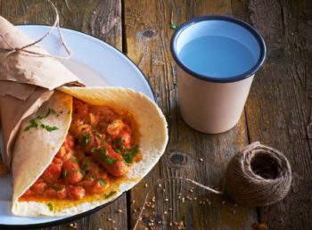 Orkaitėje, mikrobangėje arba tiesiog sausoje keptuvėje pašildykite tortilijas. Jos turi šiek tiek suminkštėti.