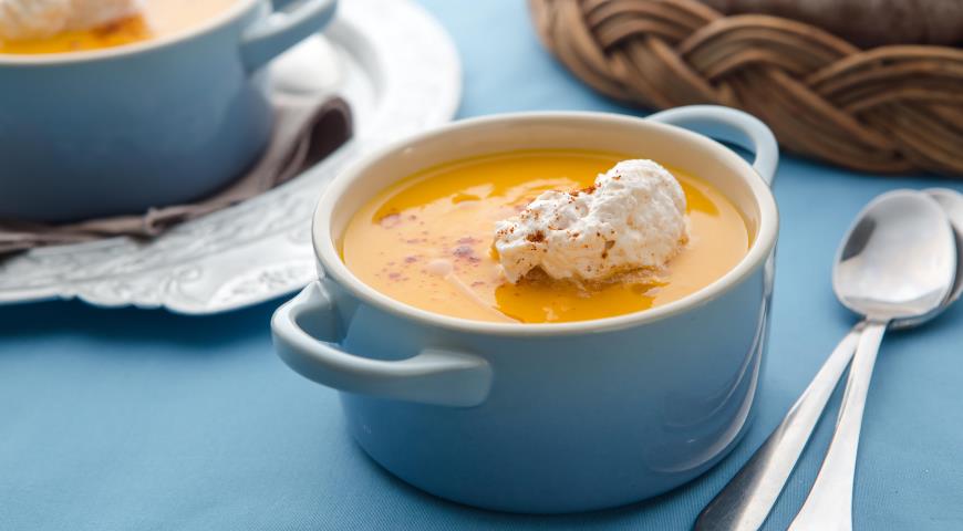 Sultinį užvirinkite. Sudėkite į jį moliūgo minkštimą ir palaukite, kol vėl užvirs. Tada sutrinkite į tyrę ir įmaišykite grietinėlę, druską, pipirus. Užvirinkite dar kartą.