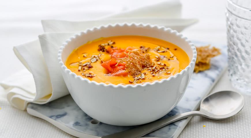 Reikės (6–8 porcijoms): 120 g rūkytos lašišos gabalėlių, 1,5 kg moliūgo minkštimo, 6 graikinių riešutų branduolių, 30 g parmezano sūrio, žiupsnelio cinamono, 800 g daržovių sultinio, 100 ml grietinėlės, 1 šaukšto aliejaus, druskos, pipirų.