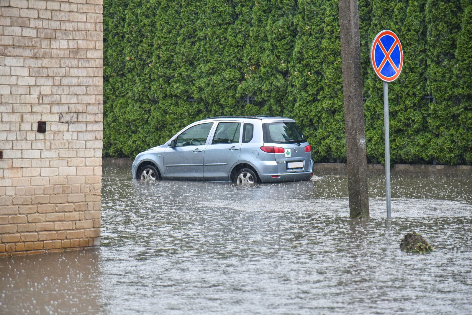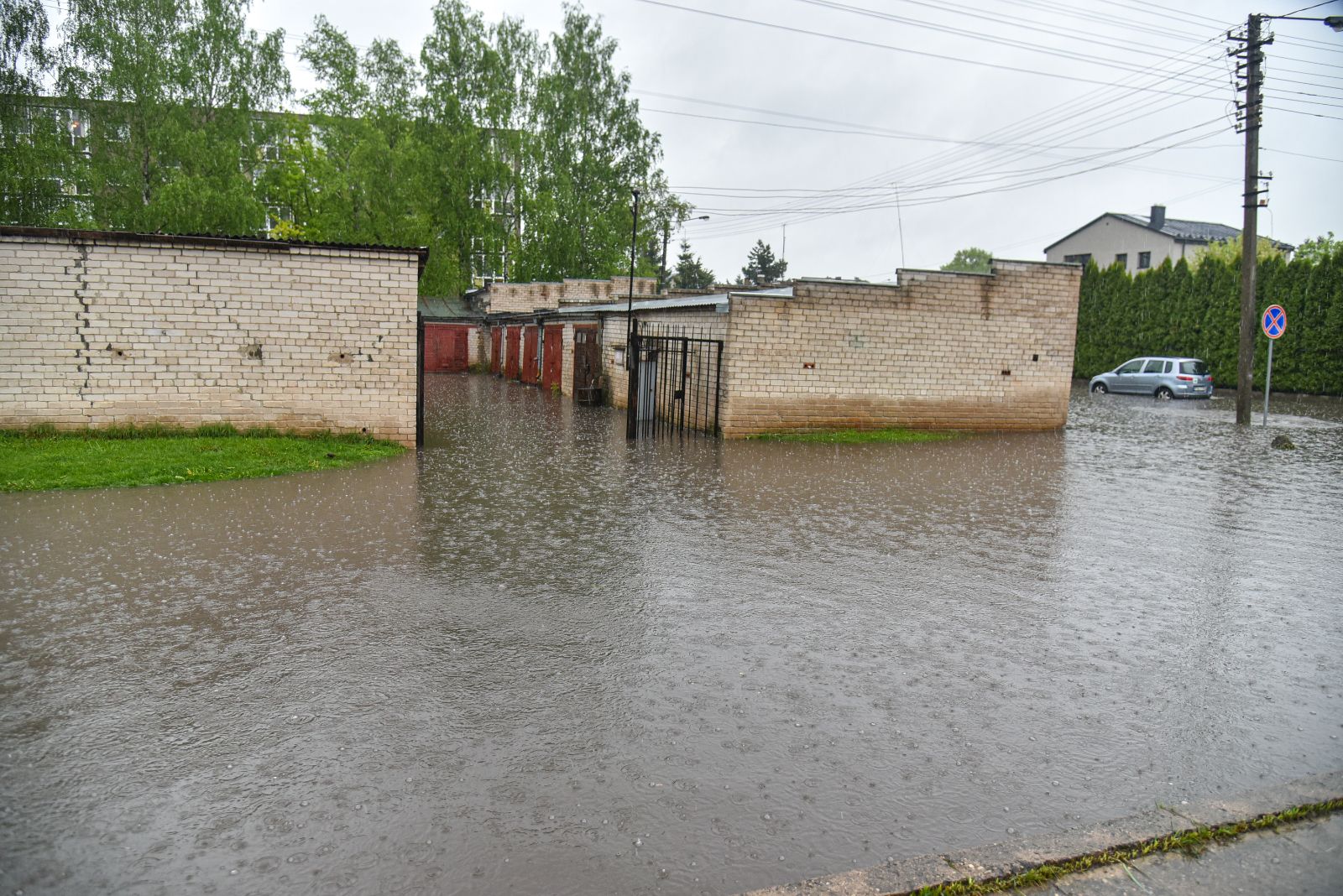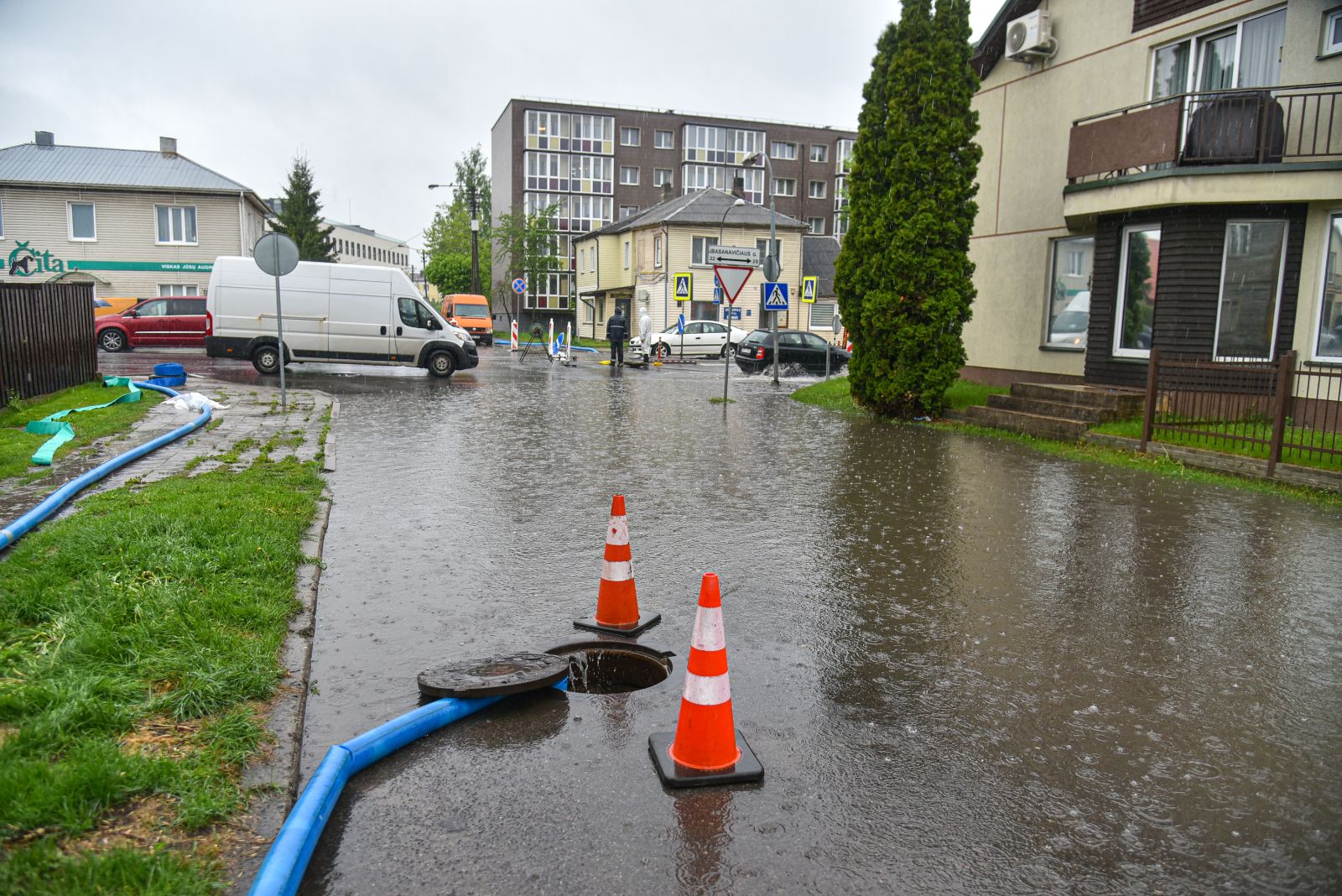 Gyvenantieji ties Algirdo ir J. Basanavičiaus gatvių sankirta ironizavo pasijutę tarsi būtų įsikūrę ne miesto centre, o prie išsiliejusios upės. Jų daugiabučių namų pamatus lietaus potvyniai pasiekė vidudienį. Vanduo apsėmė gatvę, šaligatvius ir už jų esančias vejas.
