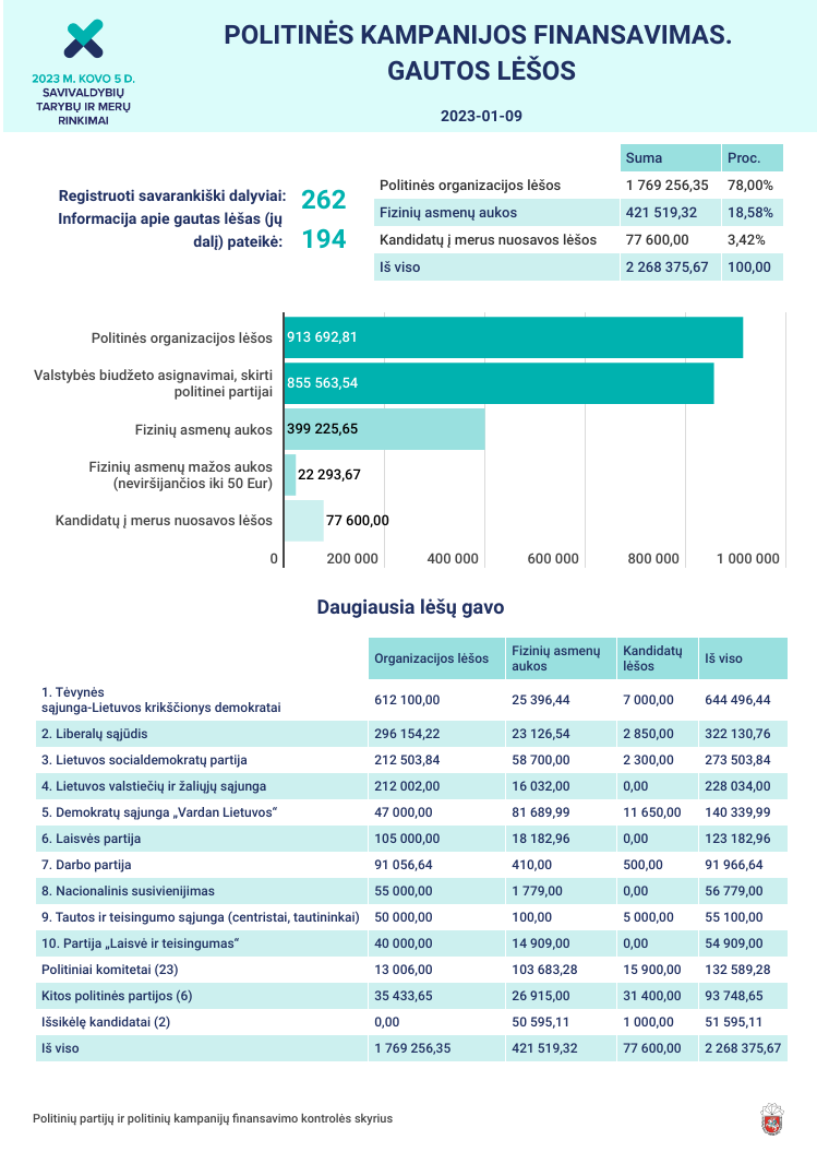 421 519 eurų iki š. m. sausio 9 d. ryto yra suaukoję fiziniai asmenys (kandidatų į savivaldybės tarybą lėšos taip pat apskaitomos kaip fizinių asmenų aukos). Dar 77 600 eurų yra skyrę kandidatai į merus iš savo asmeninių lėšų.