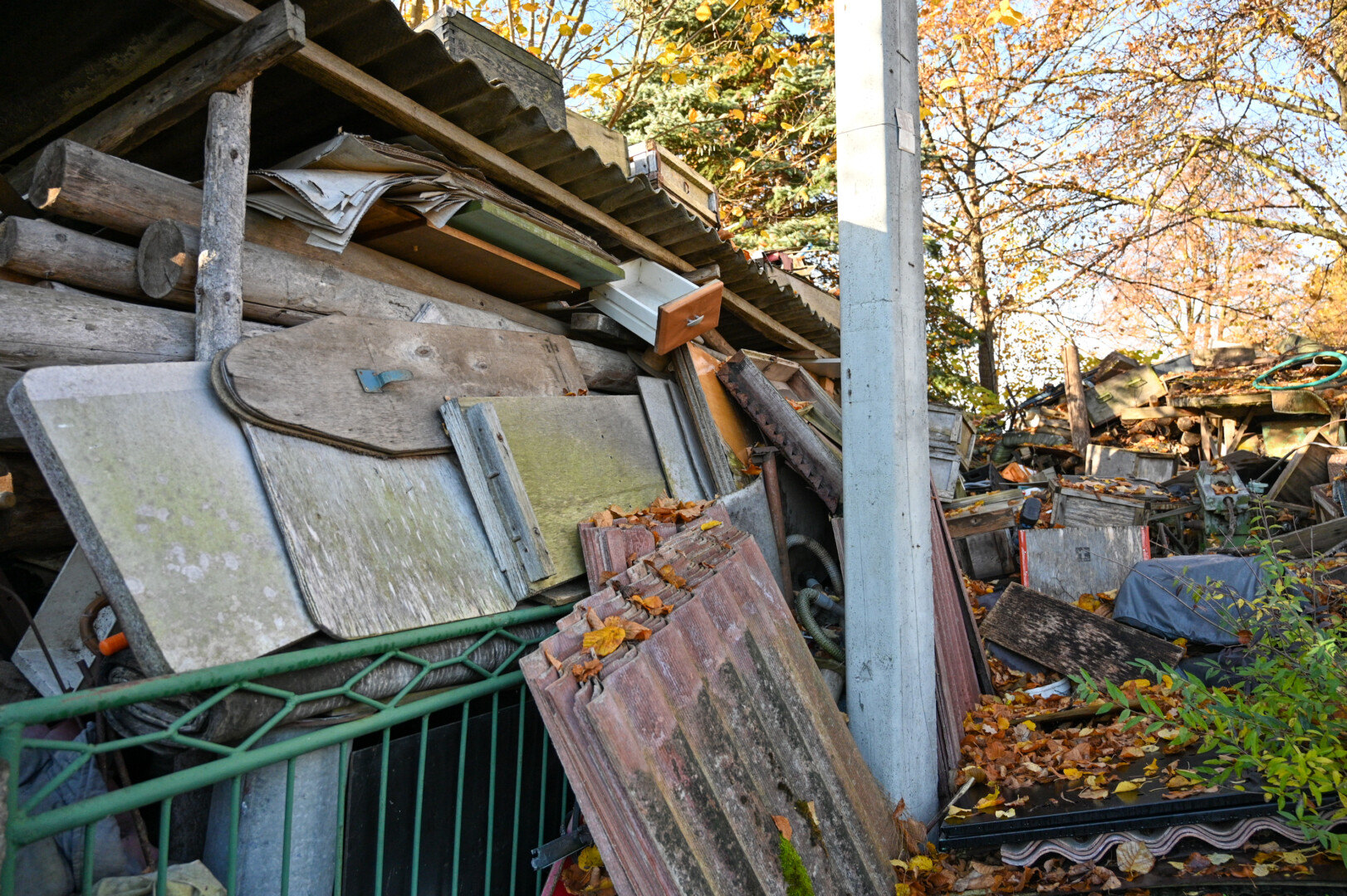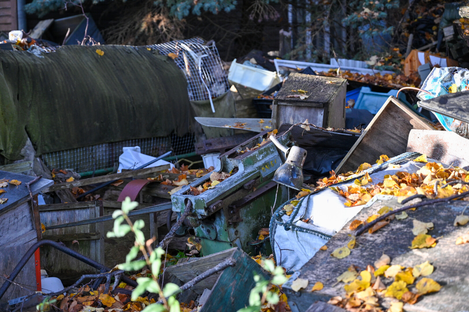 Priešais jo namo dalį – krūva įvairiausių daiktų: kaži kokios rūdijančios spintos, skardos, metaliniai, plastikiniai daiktai, rąstai, lentos, plytgaliai.