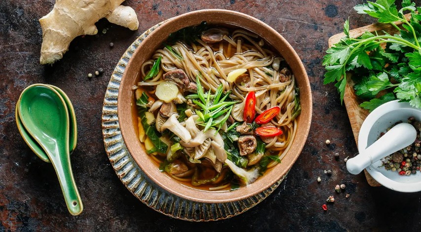 Reikės (6 porcijoms): 500 g viščiukų širdelių, 500 g pekininio kopūsto, 200 g šviežių kreivabudžių, 100 g grikių makaronų, 1 raudonos aitriosios paprikos, 2 šaukštų sojų padažo, 2 šaukštų austrių padažo, 2 šaukštų ryžių acto, 20 g imbiero, svogūno laiškų, sezamų aliejaus.