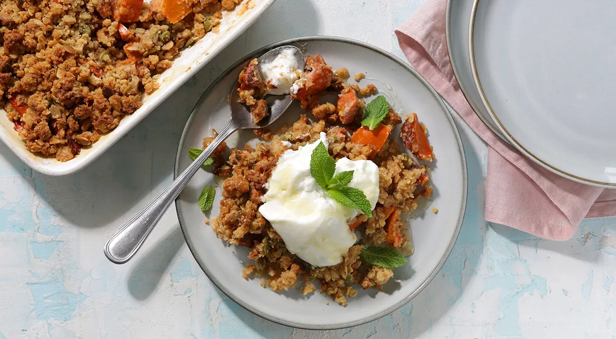 Reikės (8 porcijoms): 5 persimonų, 100 g miltų, 150 g sviesto, 180 g rudojo cukraus, 50 g avižinių dribsnių, 50 g moliūgų sėklų, 0,5 šaukštelio malto cinamono, 0,5 šaukštelio maltų gvazdikėlių, 0,25 šaukštelio muskato, 0,25 šaukštelio druskos, 1 šaukšto aliejaus, 1 šaukšto miltų – formai pabarstyti; patiekti: jogurto, medaus, 3 mėtos šakelių.