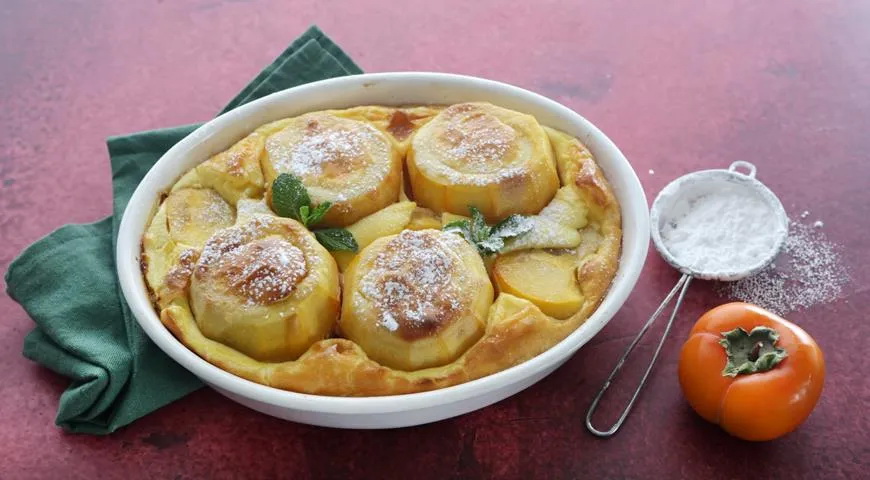 Dėkite persimonus į kepimo formą, apliekite grietininiu padažu ir kepkite orkaitėje 180 laipsnių temperatūroje 20 minučių.