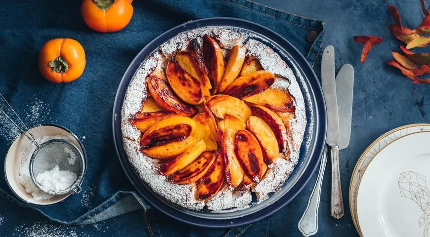 Užvirinkite vandenį su likusiu cukrumi, sudėkite persimonus ir 5 minutes pavirkite. Palikite ataušti sirupe, o paskui išdėliokite ant pyrago.