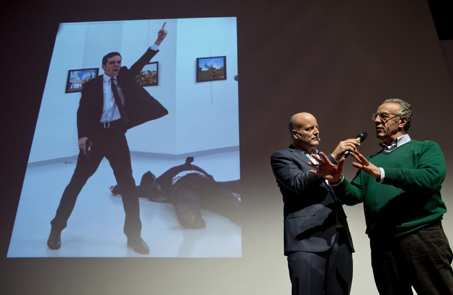 Nuotraukoje matomas 22-ejų metų turkų policininkas Mevlutas Mertas Altintasas su ginklu rankoje, stovintis šalia ką tik jo nušauto Rusijos ambasadoriaus, dalyvavusio rusų fotografijos parodos atidaryme Ankaroje gruodžio 19 d.