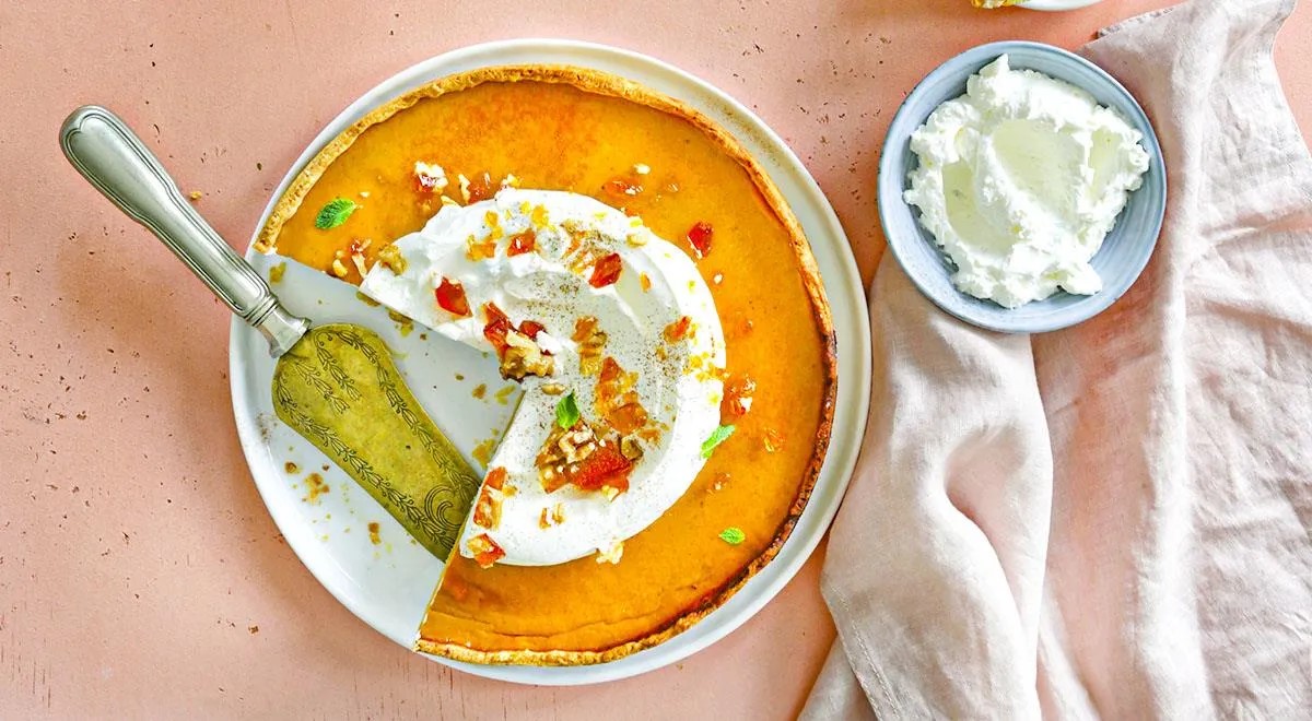 Reikės (6 porcijoms): įdarui: 1 kg moliūgo, 250 ml riebios grietinėlės, 3 kiaušinių, 6 šaukštų cukraus, 4 šaukštų medaus, 0,25 šaukštelio Kajeno paprikų, 0,5 šaukštelio cinamono, 0,25 šaukštelio muskatų, 0,25 šaukštelio maltų gvazdikėlių, 0,5 šaukštelio imbiero, druskos – ant peilio galiuko; patiekti: plaktos grietinėlės, karamelizuotų riešutų; pagrindui: 320 g miltų (ir dar šiek tiek – pabarstyti), 120 g sviesto, 1 kiaušinio trynio, žiupsnelio druskos.